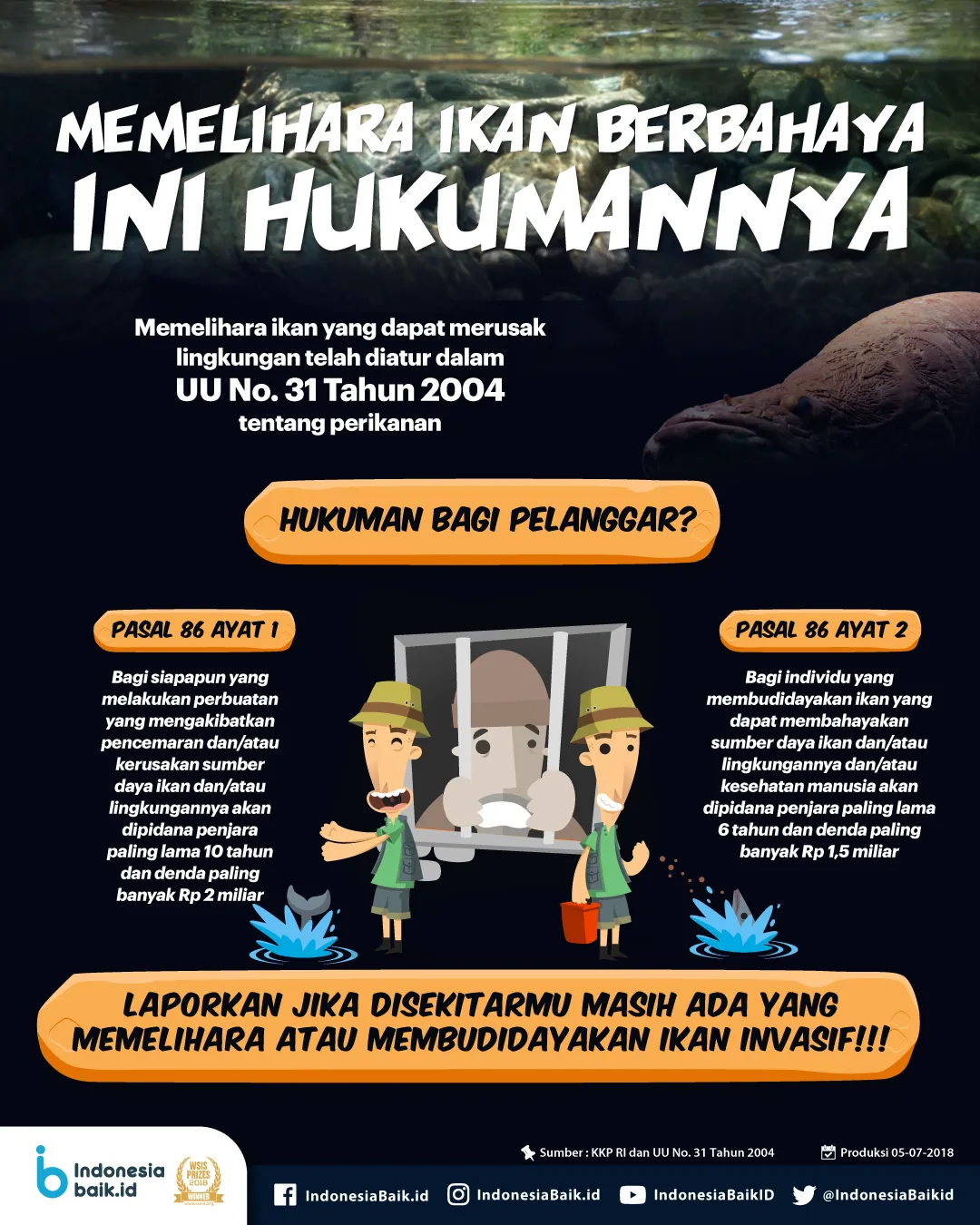 Hukuman bagi pelanggar terdapat dalam Undang-undang Nomor 31 Tahun 2004. Dalam pasal 86 ayat 1, bahwa bagi siapapun yang melakukan perbuatan yang mengakibatkan pencemaran dan/atau kerusakan sumber daya ikan dan/atau lingkungannya akan dipidana penjara paling lama 10 tahun dan denda paling banyak Rp 2 miliar. Dalam pasal 86 ayat 2, bagi individu yang membudidayakan ikan yang dapat membahayakan sumber daya ikan dan/atau lingkungannya dan/atau kesehatan manusia akan dipidana penjara paling lama 6 tahun dan denda paling banyak Rp 1,5 miliar.
