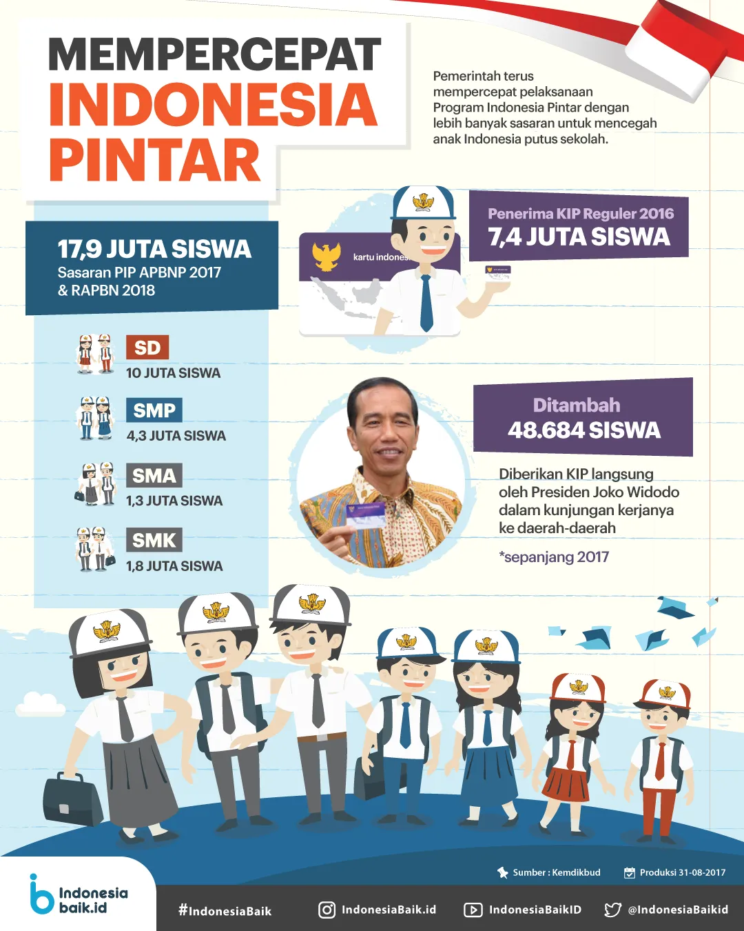 Hingga 2017, pemerintah telah memberikan 17,9 juta siswa Sasaran PIP. Sedangkan dalam RAPBN 2018 ada sebanyak 7,4 juta penerima KIP regular dan ditambah 48.684 siswa yang diberikan langsung oleh Presiden Joko Widodo dalam kunjungan kerjanya ke daerah-daerah.