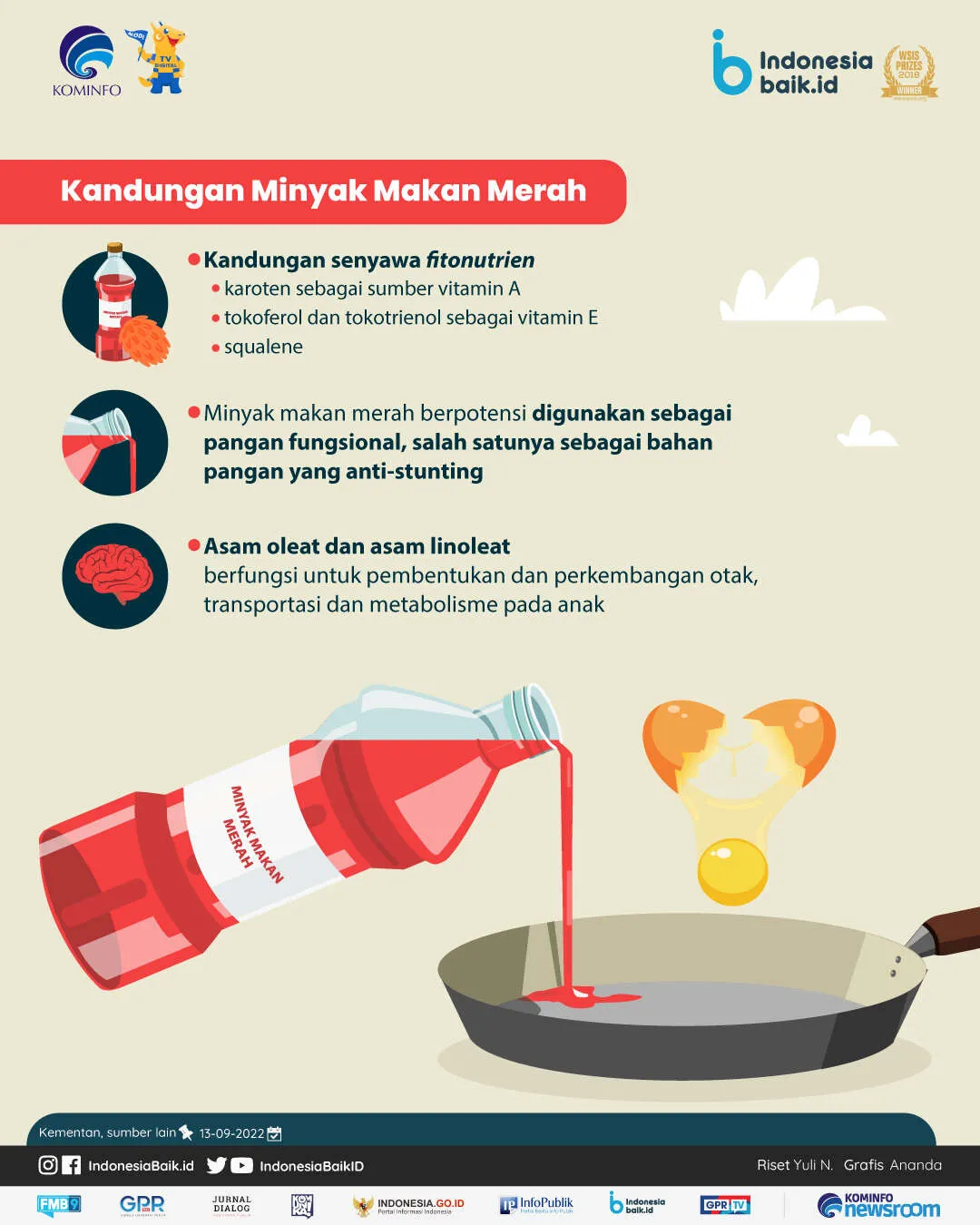 Menurut Pusat Penelitian Kelapa Sawit (PPKS), sebagaimana dikutip laman Kementerian Pertanian, minyak makan merah masih mempertahankan kandungan senyawa fitonutrien. Kandungan tersebut, meliputi karoten sebagai sumber vitamin A, tokoferol dan tokotrienol sebagai vitamin E, dan squalene. Untuk itu, minyak makan merah berpotensi digunakan sebagai pangan fungsional, salah satunya sebagai salah satu bahan pangan yang anti-stunting.