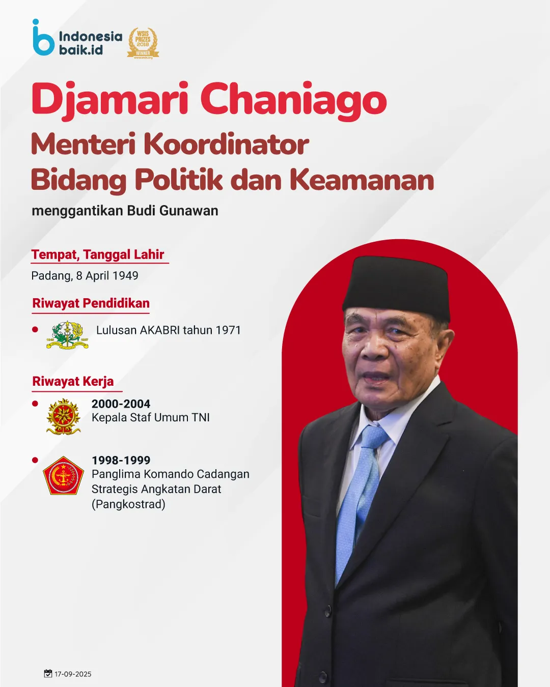 Djamari Chaniago ditunjuk menggantikan Budi Gunawan sebagai Menteri Koordinator Bidang Politik dan Keamanan. Lahir di Padang pada 8 April 1949, Djamari merupakan alumnus AKABRI tahun 1971. Pengalamannya yang luas di bidang militer membuatnya sangat layak memimpin sektor politik dan keamanan, dengan riwayat karir seperti: