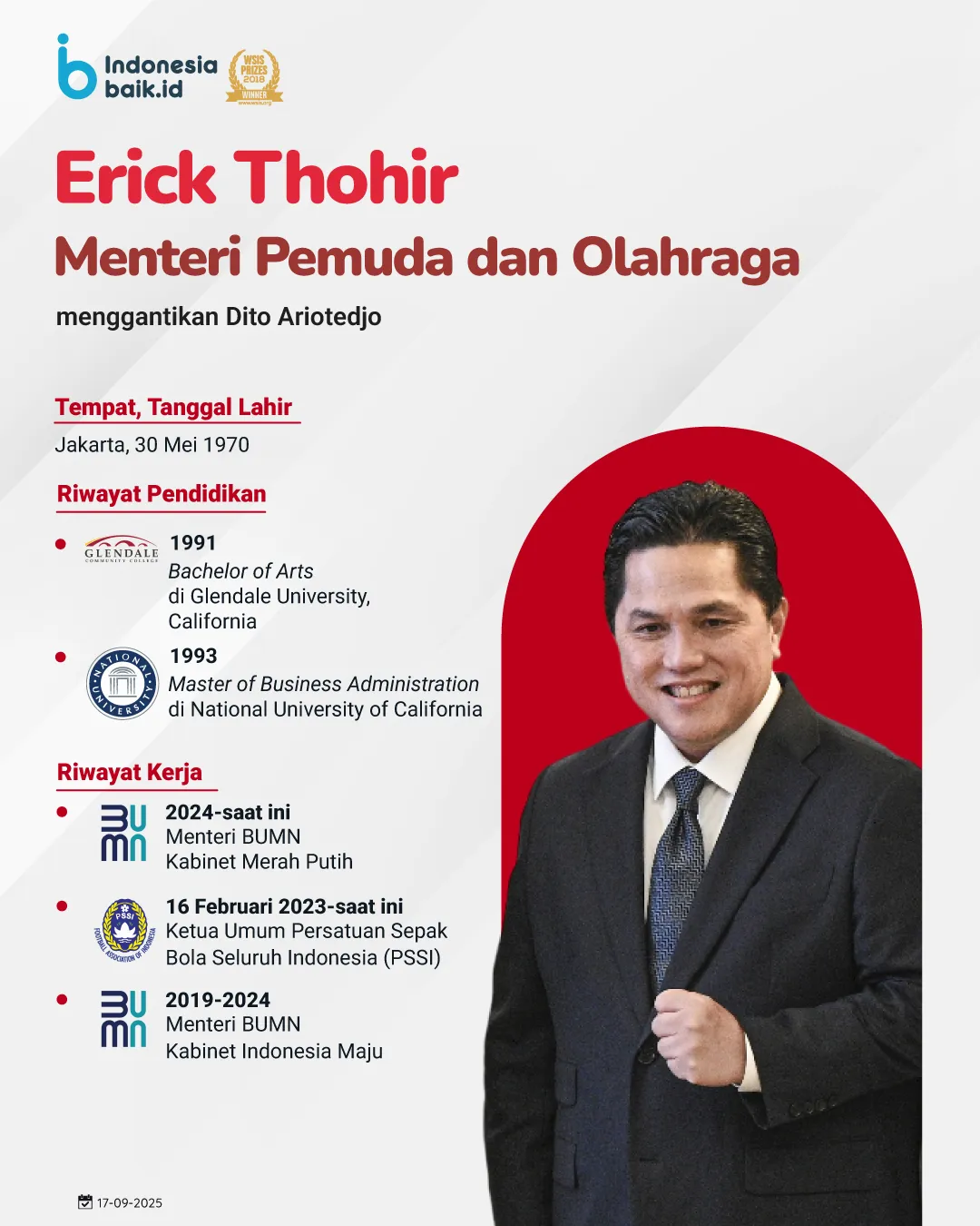 Erick Thohir resmi menggantikan Dito Ariotedjo sebagai Menteri Pemuda dan Olahraga. Pria kelahiran Jakarta, 30 Mei 1970, ini memiliki latar belakang pendidikan yang mumpuni dengan gelar Bachelor of Arts dari Glendale University, California (1991) dan Master of Business Administration dari National University of California (1993).