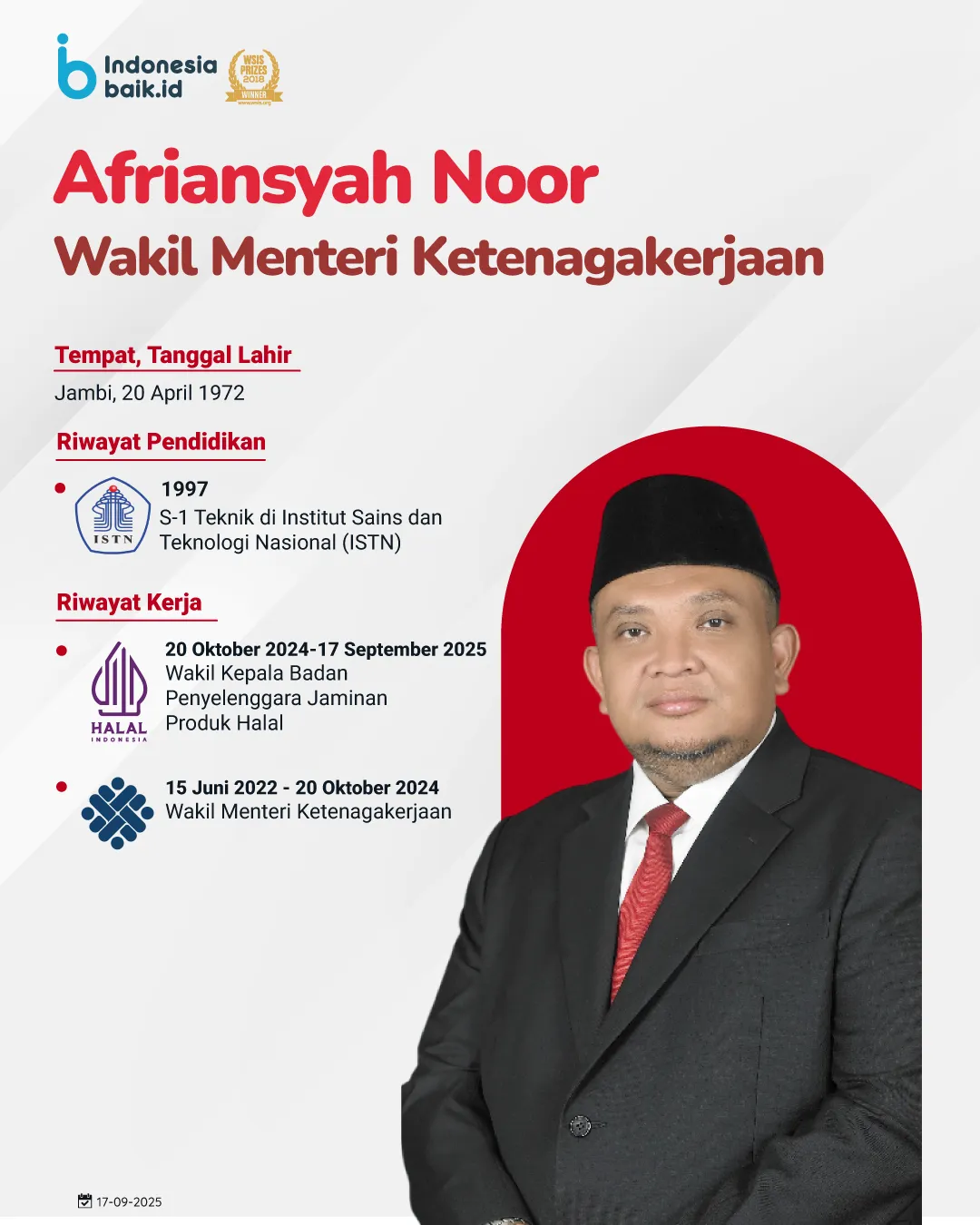 Afriansyah Noor kembali dipercaya sebagai Wakil Menteri Ketenagakerjaan. Lahir di Jambi pada 20 April 1972, Afriansyah menempuh pendidikan teknik di Institut Sains dan Teknologi Nasional (ISTN) pada 1997. Ia pernah menjabat sebagai: