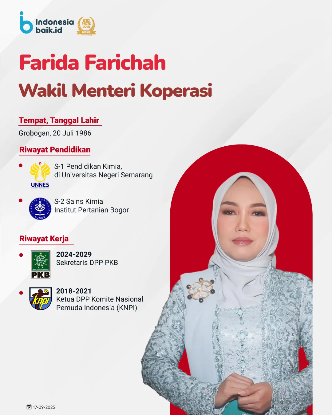 Farida Farichah resmi menjabat sebagai Wakil Menteri Koperasi. Wanita kelahiran 20 Juli 1986 ini menyelesaikan pendidikan S2 di Institut Pertanian Bogor (IPB). Farida memiliki pengalaman organisasi dan politik yang kuat, seperti: