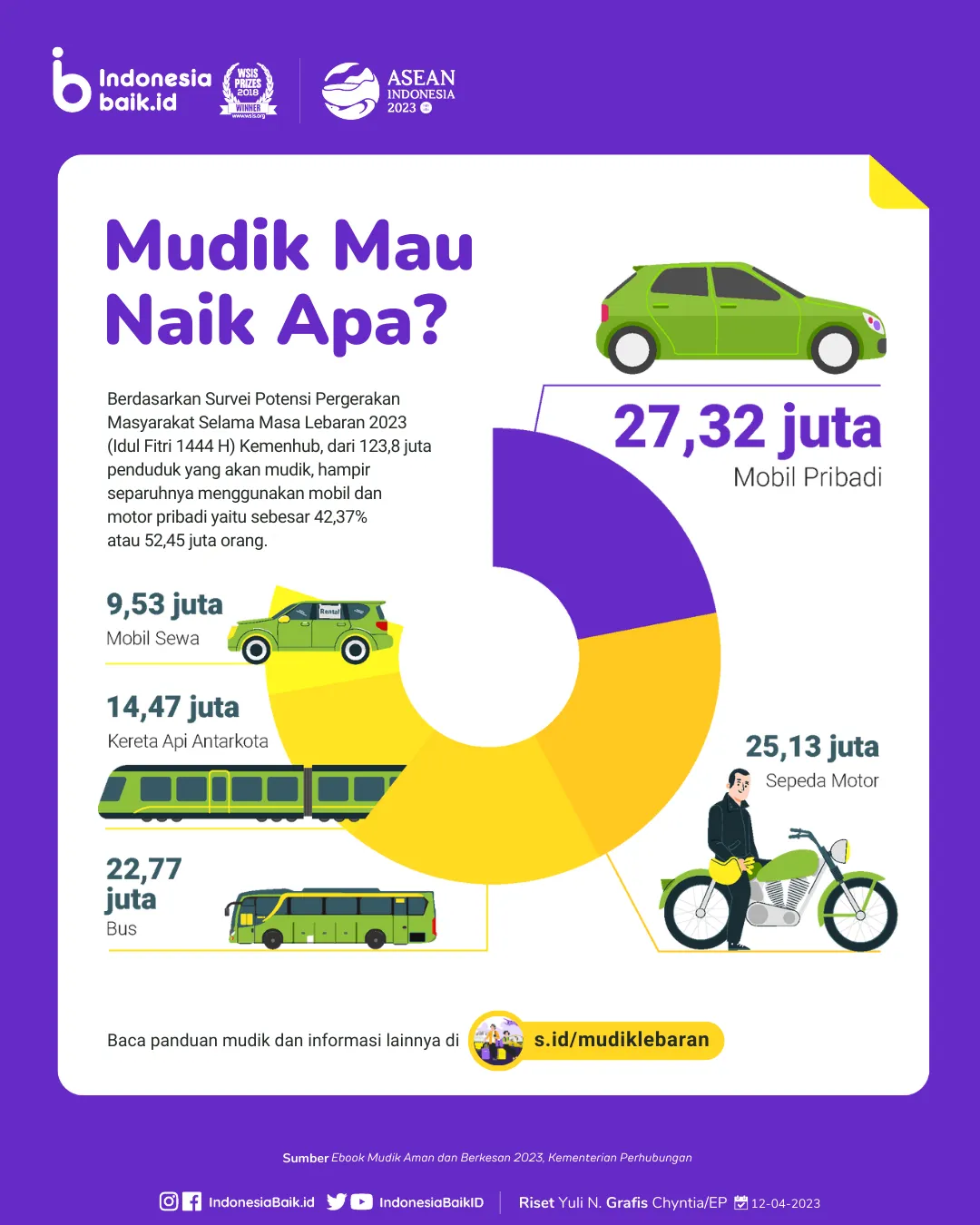 Berdasarkan moda transportasinya, sebanyak 27,32 juta pemudik diproyeksikan menggunakan mobil pribadi pada Lebaran 2023. Jumlah tersebut setara dengan 22,07% dari total pemudik. Sebanyak 25,13 juta pemudik diperkirakan pergi ke kampung halamannya menggunakan sepeda motor.