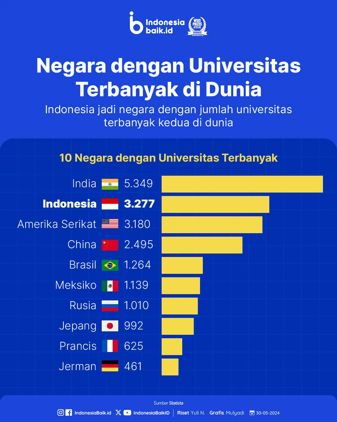 indonesiabaik.id - Memang, tidak bisa dipungkiri populasi yang tinggi juga nyatanya mencerminkan kebutuhan yang tinggi terhadap universitas. Untuk itu, tidak begitu mengherankan jika Indonesia masuk menjadi negara dengan universitas terbanyak di dunia.