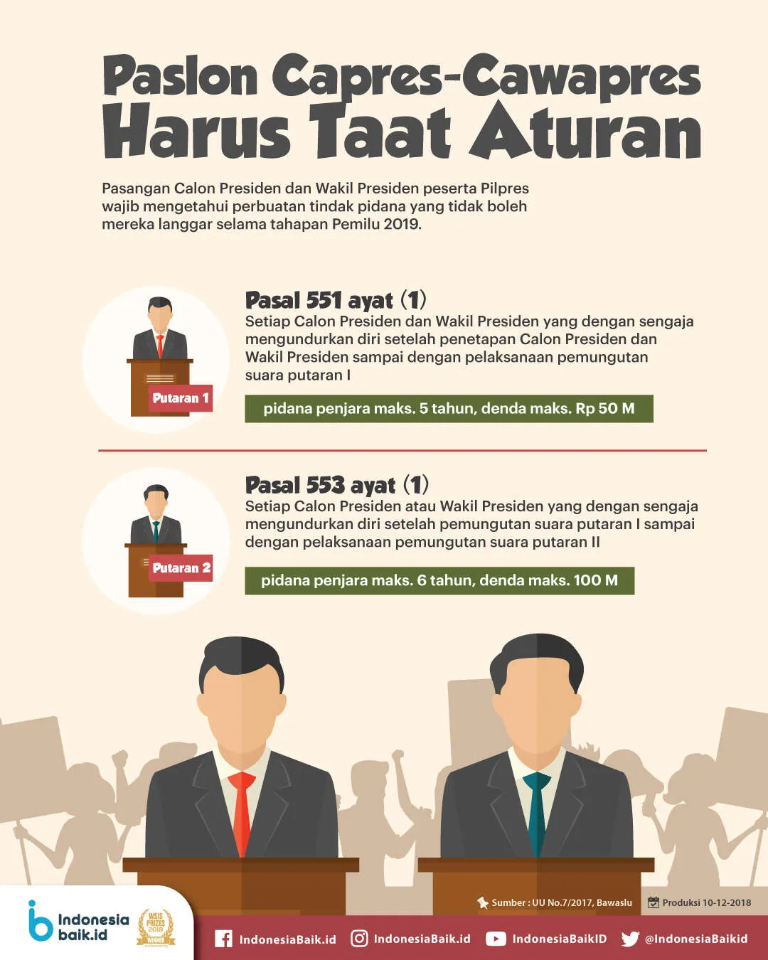 Setidaknya ada dua pasal tindak pidana yang wajib ditaati oleh paslon capres-cawapres peserta Pemilu dan Pilpres 2019. Pasal 551 ayat (1) menyatakan bahwa setiap Calon Presiden dan Wakil Presiden yang dengan sengaja mengundurkan diri setelah penetapan Calon Presiden dan Wakil Presiden sampai dengan pelaksanaan pemungutan suara putaran I dapat diancam pidana penjara paling lama 5 tahun dengan denda paling banyak Rp 50 miliar.