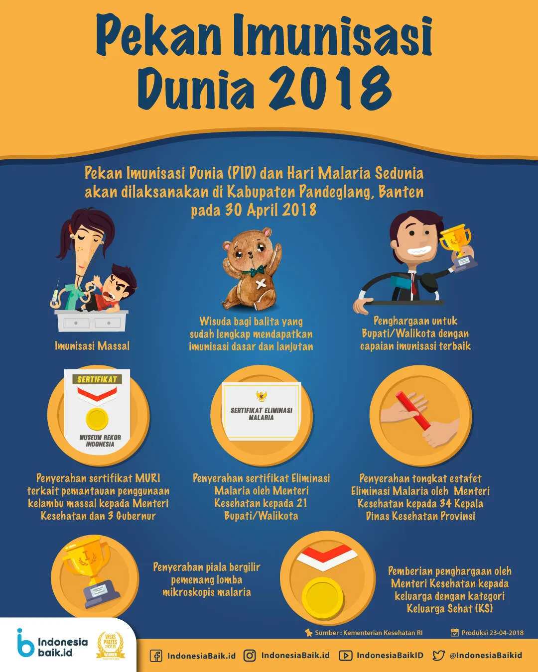 Indonesiabaik.id - Kegiatan dalam rangka Pekan Imunisasi Dunia (PID) dan hari Malaria Sedunia ini rencananya akan dilaksanakan di Kabupaten Pandeglang, Provinsi Banten pada hari Senin tanggal 30 April 2018. Tema global acara PID yaitu “Ready To Beat Malaria” dan tema nasional yaitu “Bebas Malaria, Prestasi Bangsa.” Adapun sub tema dalam acara PID, yaitu “Keluarga Sehat Keluarga Bebas Malaria” dan “Bersama Mitra Menuju Bebas Malaria.”