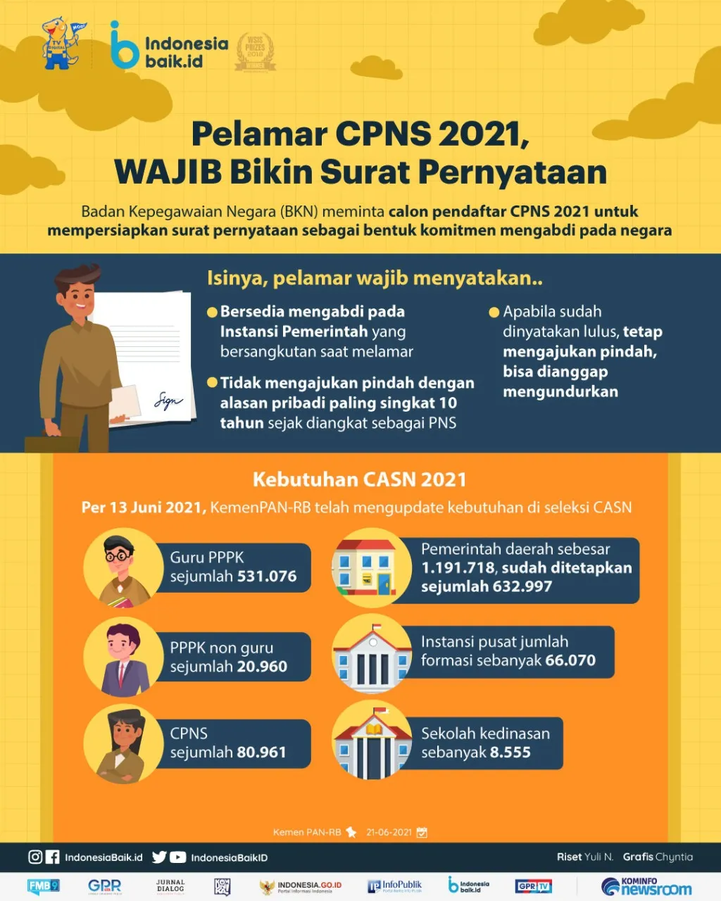 Indonesiabaik.id - Masyarakat tengah menanti pembukaan seleksi Calon Pegawai Negeri Sipil (CPNS) tahun formasi 2021. Namun, Badan Kepegawaian Negara (BKN) meminta calon pendaftar untuk tidak terburu-buru dalam memilih formasi CPNS yang diinginkannya dan pelamar CPNS wajib membuat surat pernyataan.