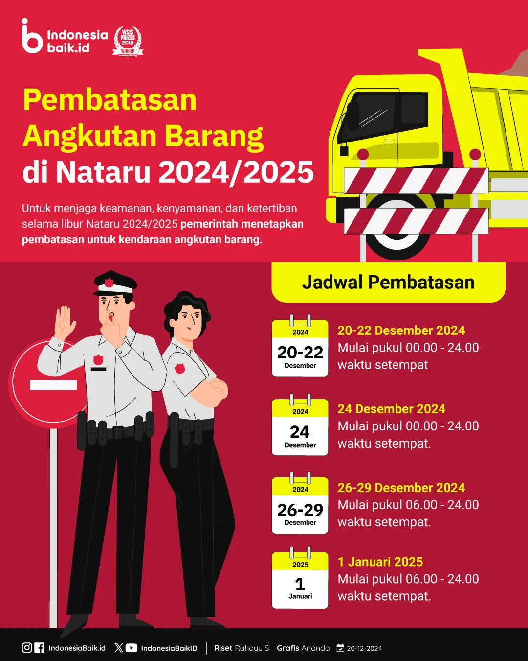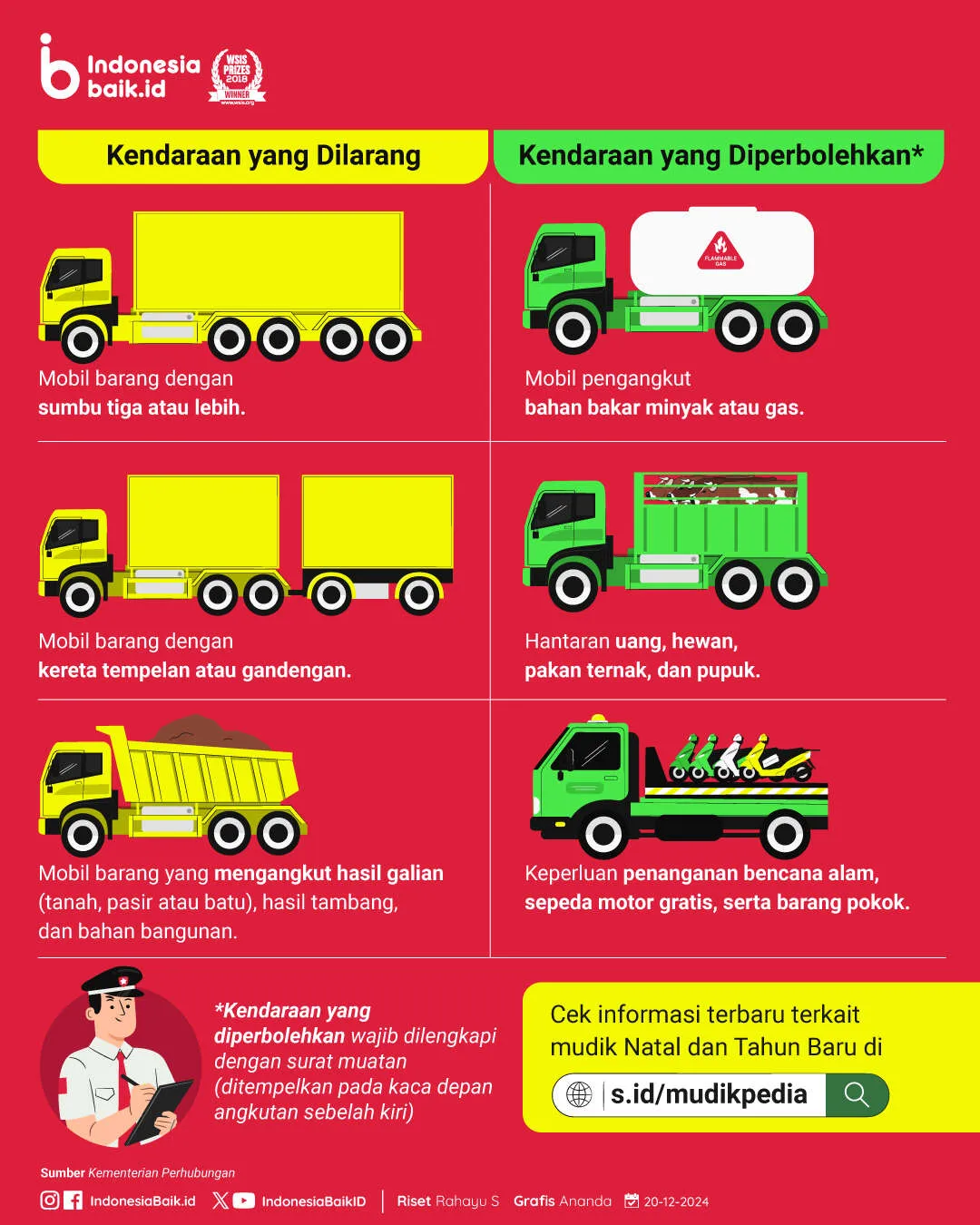 Kendaraan yang diperbolehkan wajib dilengkapi dengan surat muatan yang ditempelkan pada kaca depan angkutan sebelah kiri. Jangan lupa untuk menjaga keamanan dan ketertiban selama libur Nataru 2024/2025. Tetap patuhi aturan dan jadilah pengguna jalan yang bijak
