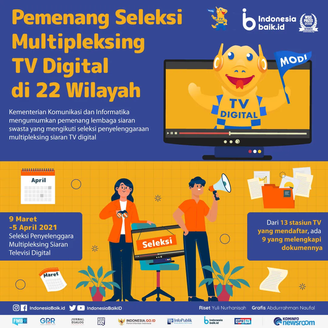Indonesiabaik.id - Kementerian Komunikasi dan Informatika (Kemkominfo) mengumumkan para pemenang lembaga siaran swasta yang mengikuti seleksi penyelenggaraan multipleksing siaran TV digital di 22 wilayah di seluruh Indonesia.