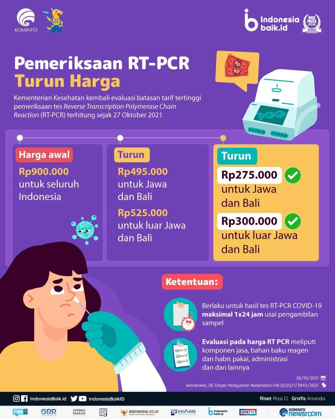 indonesiabaik.id - Kementerian Kesehatan kembali evaluasi batasan tarif tertinggi pemeriksaan tes Reverse Transcription Polymerase Chain Reaction (RT-PCR) terhitung sejak 27 Oktober 2021.