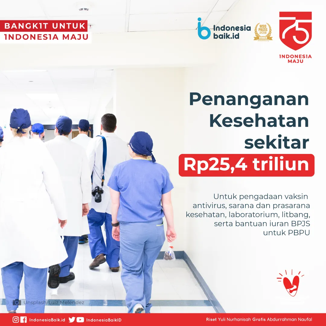 Secara perinci, anggaran akan dialokasikan untuk penanganan kesehatan sekitar Rp 25,4 triliun. Dana akan digunakan untuk pengadaan vaksin antivirus, sarana dan prasarana kesehatan, laboratorium, litbang, serta bantuan iuran BPJS untuk PBPU.
