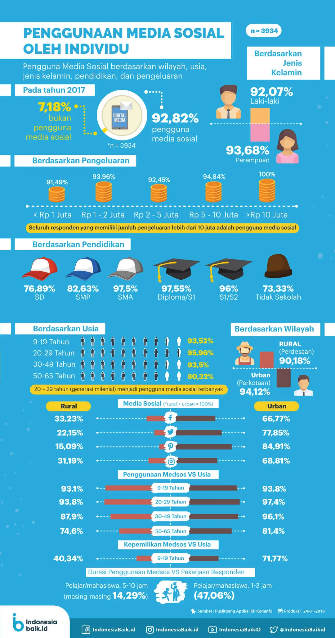 Indonesiabaik.id - Pada tahun 2017, pengguna media sosial memiliki angka yang sangat signifikan yaitu 92,82% dan bukan pengguna media sosial 7,18%.