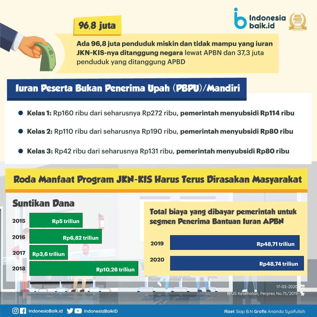 Ya, dari 222 juta peserta JKN-KIS, sekitar 60 persen peserta dibiayai oleh pemerintah. Tepatnya, ada 96,8 juta penduduk miskin dan tidak mampu yang iuran JKN-KIS-nya ditanggung negara lewat APBN dan 37,3 juta penduduk yang ditanggung oleh APBD. Selain itu, ada iuran untuk aparatur sipil negara maupun TNI dan Polri.