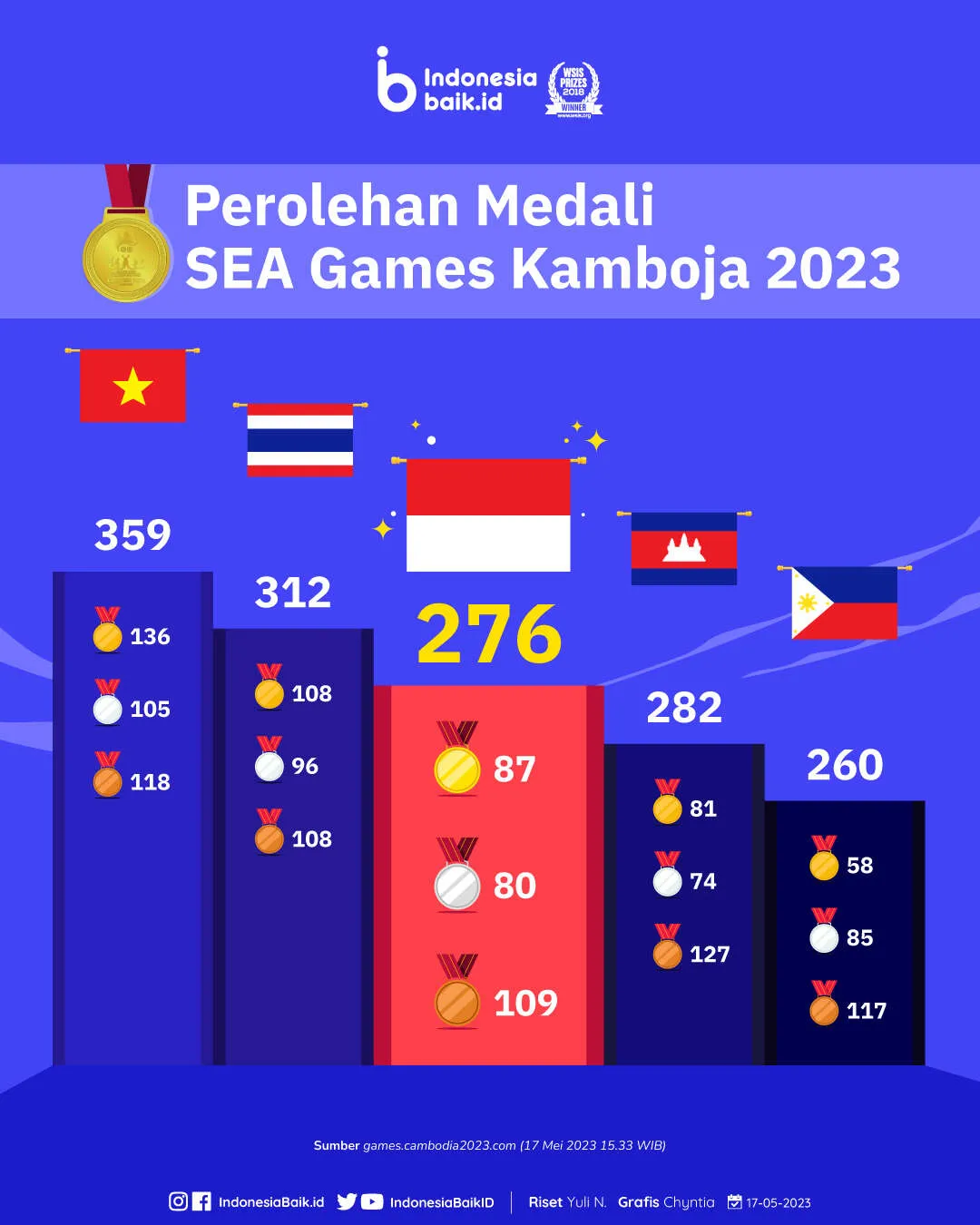 Dikutip dari situs resmi SEA Games 2023 Kamboja, Rabu (17/5/2023), Indonesia meraup 87 emas, 80 perak, dan 109 perunggu. Sedangkan, Vietnam berhasil mempertahankan posisinya hingga menjadi juara umum dengan total raihan 355 medali, terdiri dari 136 emas, 105 perak, dan 144 perunggu.