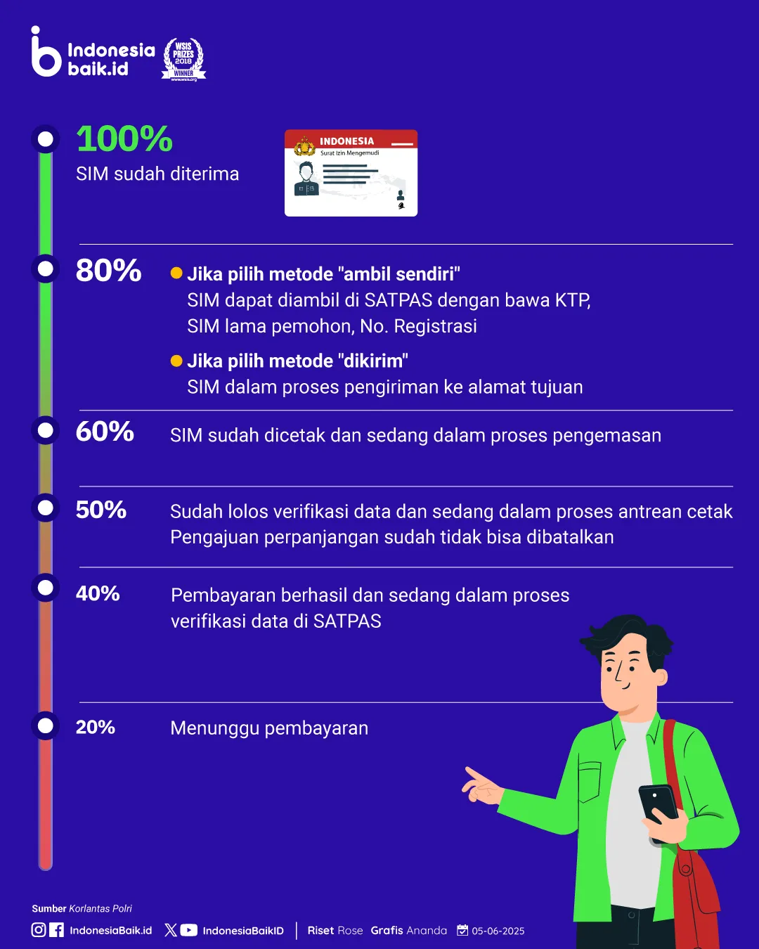 For your info, melansir informasi dari Korlantas Polri, setelah melakukan permohonan perpanjangan SIM secara online, nantinya akan ada angka persentase yang menunjukkan status permohonan. Angka-angka ini menggambarkan sejauh mana proses berjalan, mulai dari pendaftaran hingga SIM diterima.