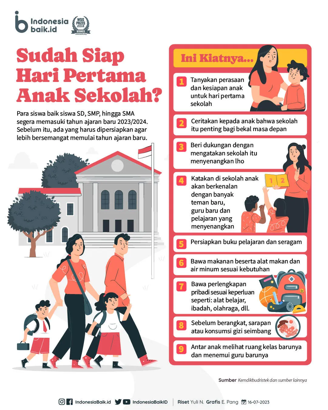 Indonesiabaik.id - Hari-hari pertama anak masuk sekolah adalah hari yang sangat dinantikan oleh orang tua. Tentu saja di hari pertama, anak-anak perlu mendapatkan pengalaman yang baik saat mereka berada di sekolah. Sebelum itu, ada banyak hal yang harus dipersiapkan agar lebih siap dan bersemangat.
