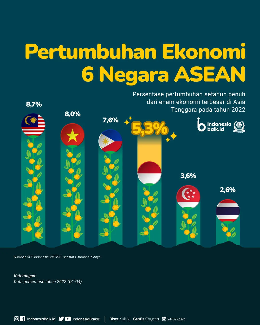 Indonesiabaik.id - Sejumlah negara di kawasan Asia Tenggara telah merilis data pertumbuhan ekonominya pada kuartal III/2022, diantaranya Indonesia, Malaysia, Singapura, Thailand, Filipina, Vietnam.