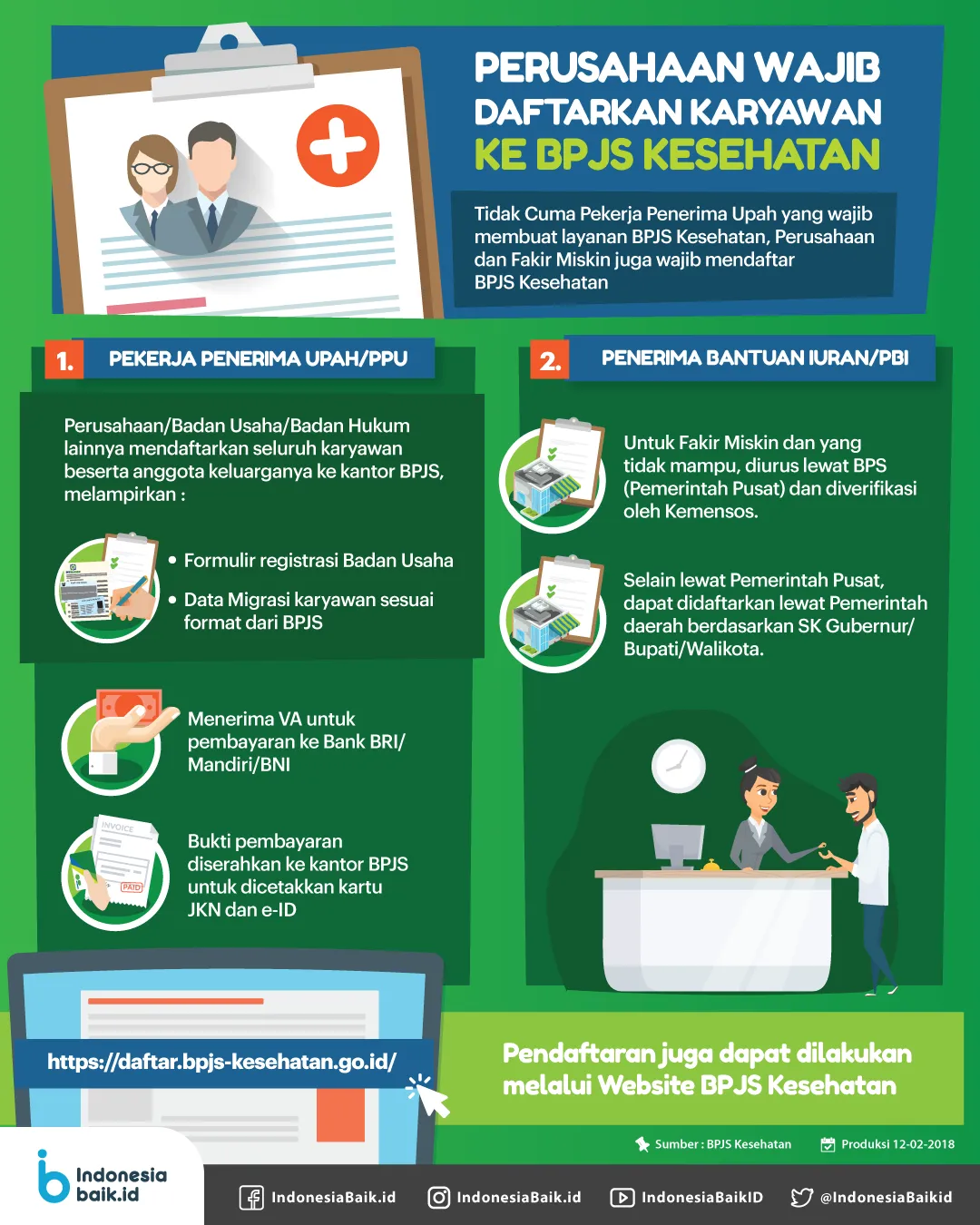 Indonesiabaik.id - Program Jaminan Kesehatan Nasional (JKN) wajib didaftarkan oleh Perusahaan, Badan Usaha atau Badan Hukum kepada seluruh karyawan beserta anggota keluarganya, dan Fakir Miskin atau yang tidak mampu juga wajib mendaftar BPJS Kesehatan. Karena program JKN harus bisa dirasakan oleh seluruh masyarakat Indonesia.