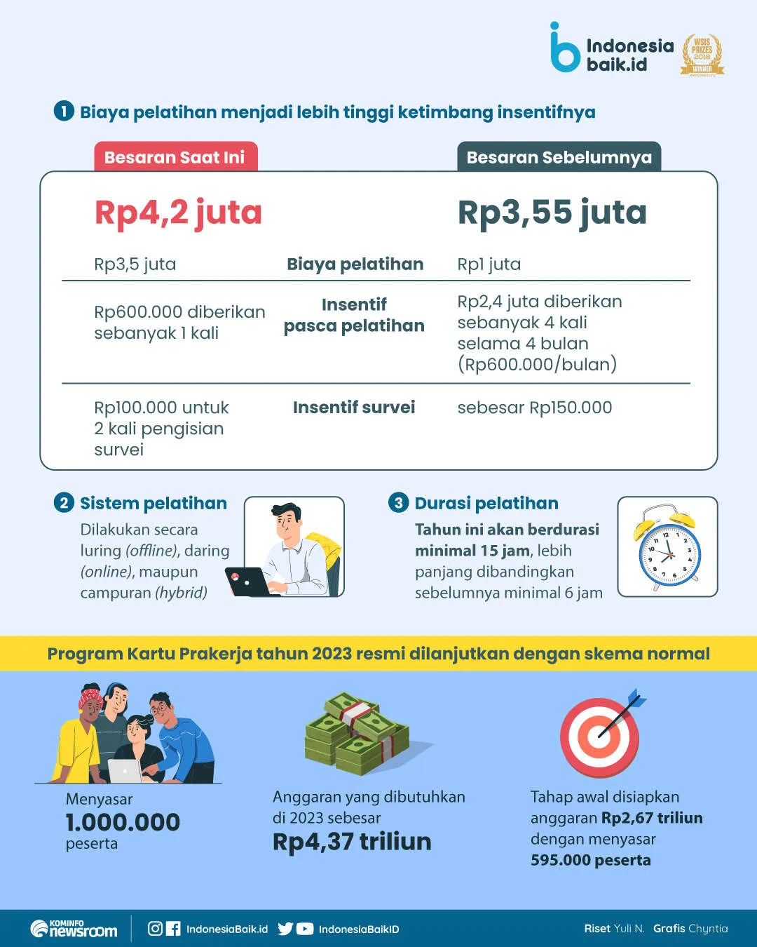 Program Kartu Prakerja tahun ini hanya menyasar 1 juta peserta seiring dengan perubahan dari skema semi bantuan sosial (bansos) ke skema normal. Nah, karena perubahan ini tentu saja anggaran yang dibutuhkan di 2023 pun berubah menjadi sebesar Rp4,37 triliun.