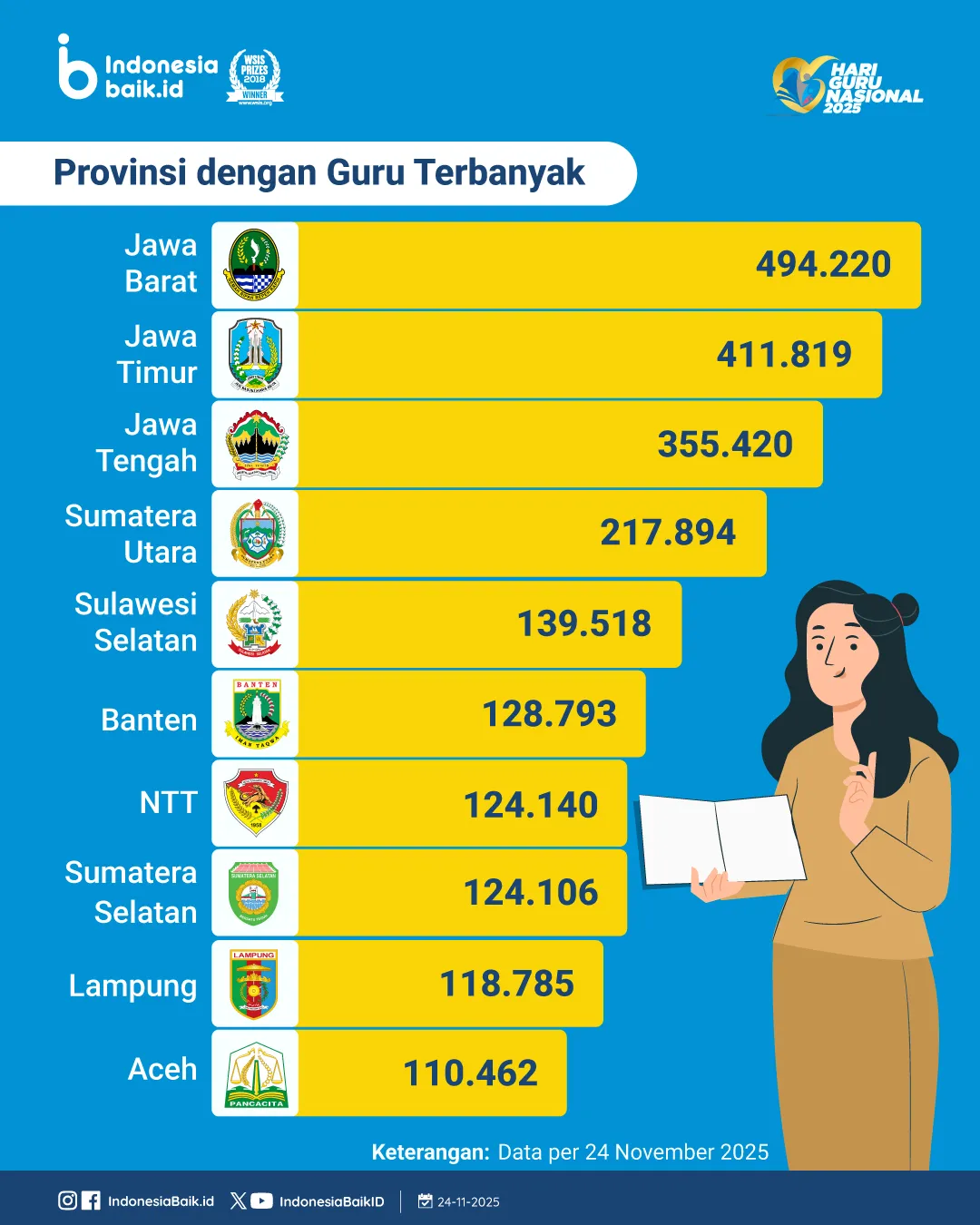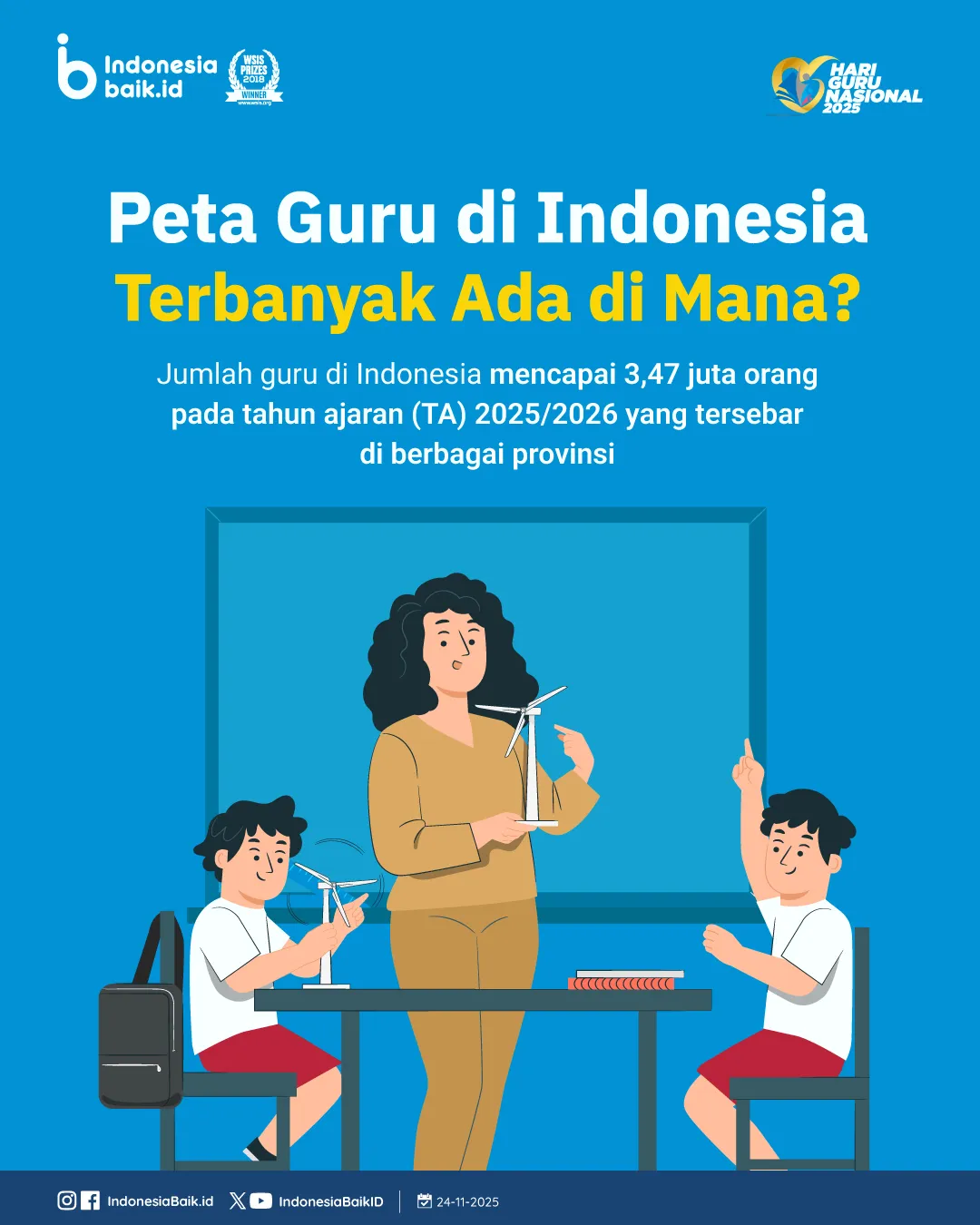 indonesiabaik.id — Jumlah guru di Indonesia terus meningkat seiring kebutuhan pendidikan nasional. Pada tahun ajaran (TA) 2025/2026, total guru mencapai 3,47 juta orang yang tersebar di seluruh provinsi. Data per 24 November 2025 menunjukkan bahwa Provinsi Jawa Barat masih memegang posisi sebagai daerah dengan jumlah guru terbanyak di Indonesia.