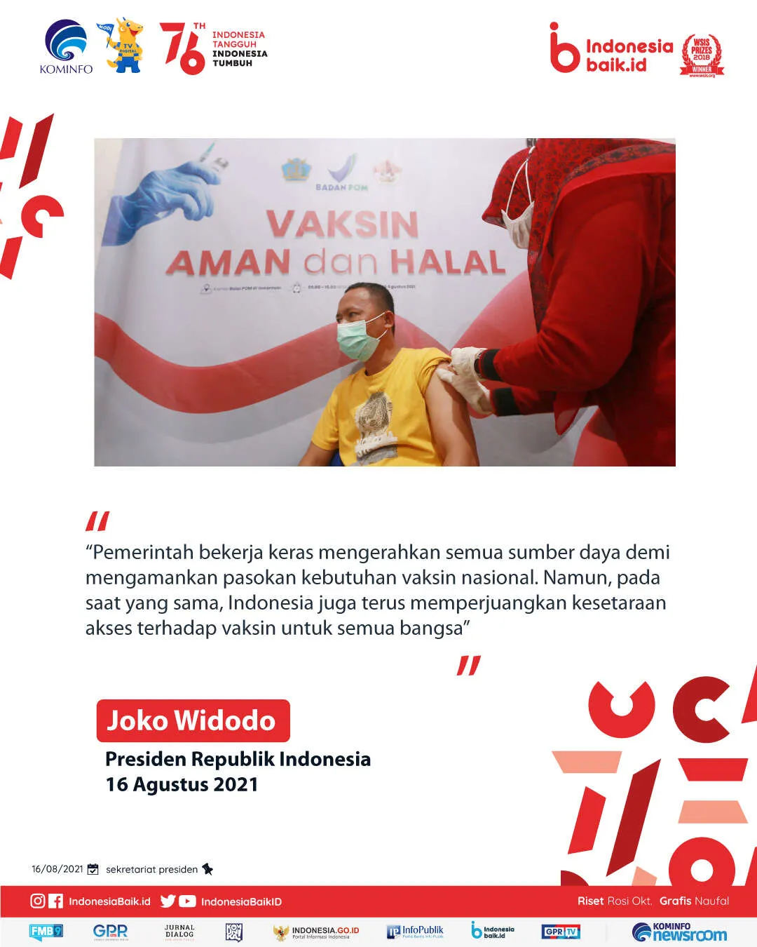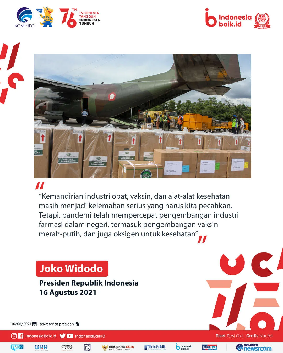 Presiden menambahkan bahwa Indonesia Tangguh, Indonesia Tumbuh, yang menjadi semboyan Bulan Kemerdekaan pada tahun ini, hanya bisa diraih dengan sikap terbuka dan siap berubah menghadapi dunia yang penuh disrupsi. “Indonesia Tangguh, Indonesia Tumbuh, hanya bisa dicapai jika kita semua bahu-membahu dan saling bergandeng tangan dalam satu tujuan. Kita harus tangguh dalam menghadapi pandemi dan berbagai ujian yang akan kita hadapi dan kita harus terus tumbuh dalam menggapai cita-cita bangsa,” ungkap Joko Widodo.