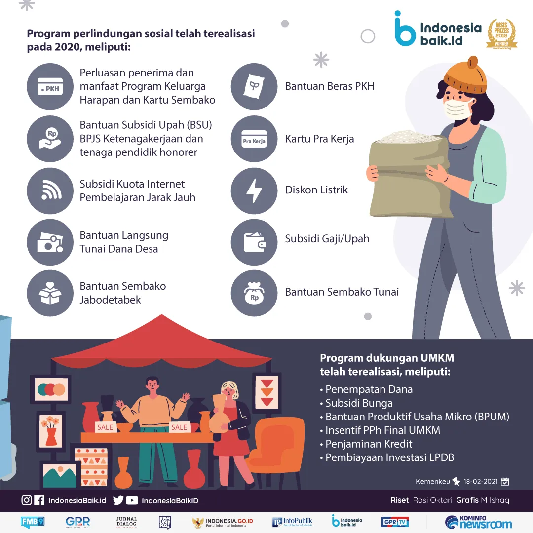Sementara untuk program dukungan UMKM selama 2020 telah terealisasi sebanyak Rp112,4 triliun yang meliputi bantuan; Penempatan Dana, Subsidi Bunga, Bantuan Produktif Usaha Mikro (BPUM), Insentif PPh Final UMKM, Penjaminan Kredit, dan Pembiayaan Investasi LPDB.