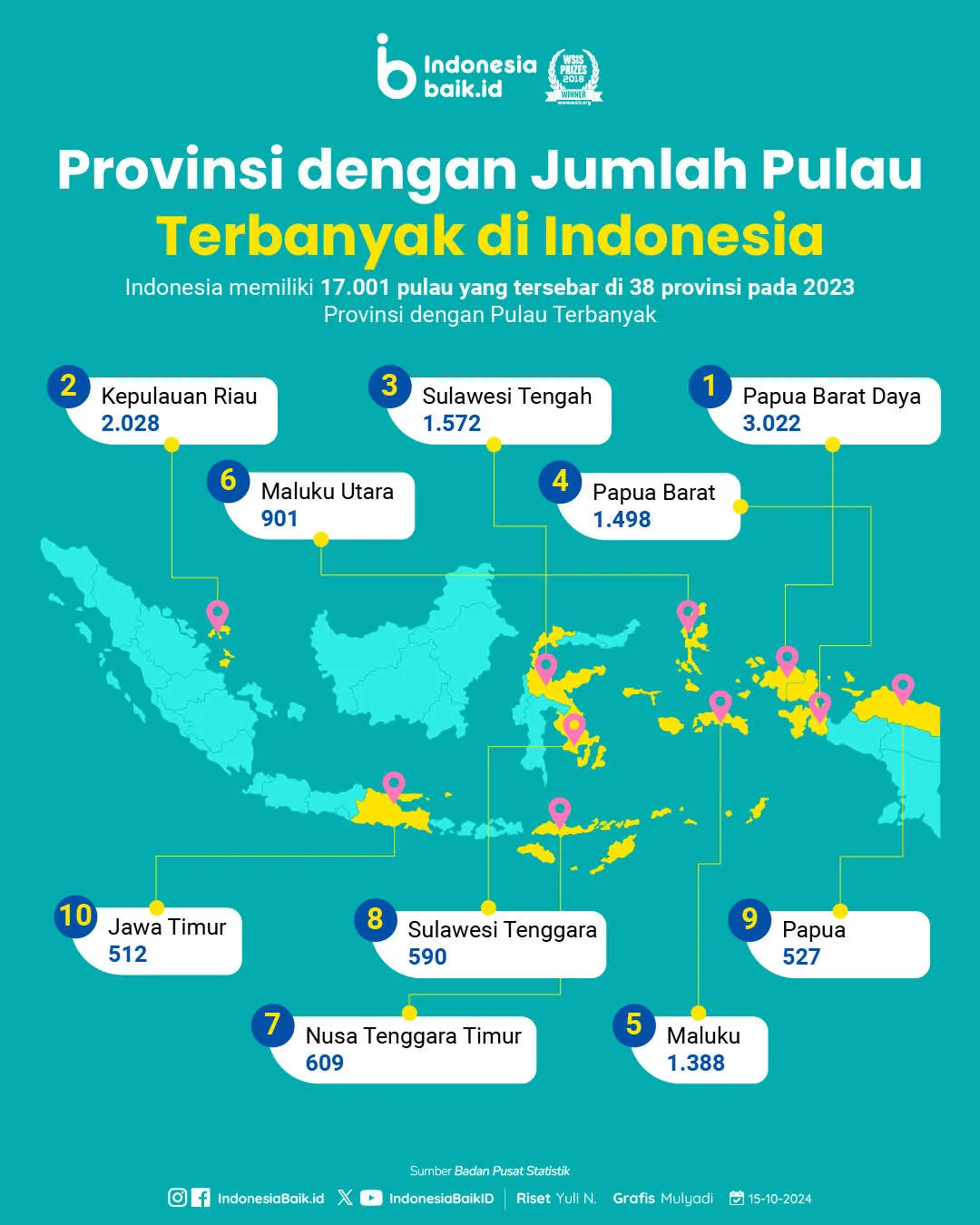 Indonesiabaik.id - Indonesia merupakan salah satu negara kepulauan terbesar di dunia. Pemerintah melalui Badan Pusat Statistik mencatat jumlah pulau di Indonesia menjadi 17.001 pulau yang tersebar di berbagai provinsi.