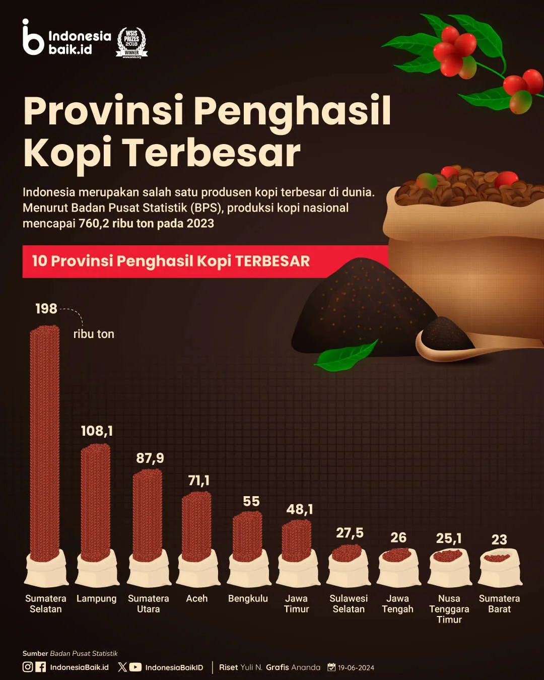 Pada 2022 Sumatra Selatan menjadi provinsi penghasil kopi terbesar, yakni 212,4 ribu ton atau 26,72% dari total produksi kopi nasional. Selanjutnya ada Lampung dengan produksi kopi 124,5 ribu ton, Sumatra Utara 87 ribu ton, dan Aceh 75,3 ribu ton.