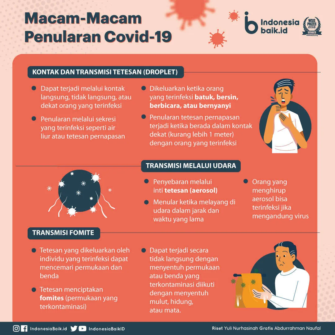 Penularan virus corona dapat terjadi melalui kontak langsung, tidak langsung, atau dekat dengan orang yang terinfeksi melalui sekresi yang terinfeksi seperti air liur dan sekresi pernapasan atau tetesan pernapasan mereka. Air liur atau tetesan pernapasan ini dikeluarkan ketika orang yang terinfeksi batuk, bersin, berbicara, atau bernyanyi. Penularan tetesan pernapasan dapat terjadi ketika seseorang berada dalam kontak dekat (kurang lebih 1 meter) dengan orang yang terinfeksi.