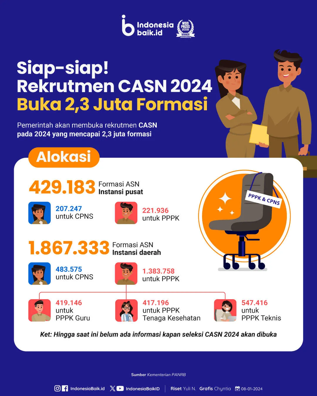 Indonesiabaik.id - Pemerintah mengumumkan pembukaan seleksi calon aparatur sipil negara atau ASN. Total jumlah rekrutmen ASN pada 2024 mencapai 2,3 juta formasi.