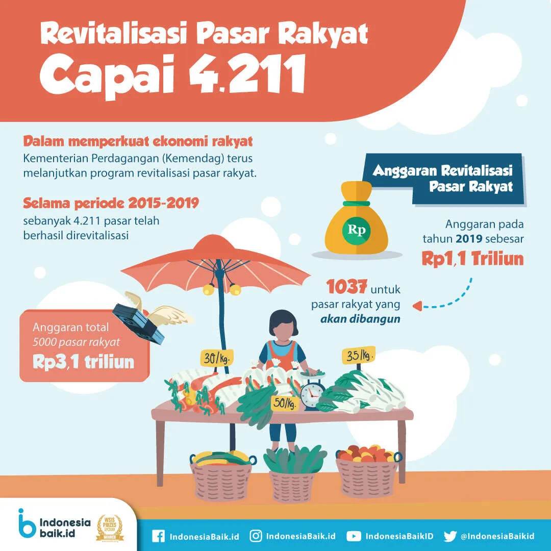 Indonesiabaik.id - Kementerian Perdagangan (Kemendag) optimis program pembangunan dan revitalisasi 5.000 pasar rakyat bisa tercapai hingga akhir 2019. Program ini dilaksanakan dalam rangka meningkatkan daya saing pasar tradisional di seluruh wilayah Indonesia. Hingga periode dari 2015-2018, sudah sebanyak 4.211 pasar telah berhasil direvitalisasi.