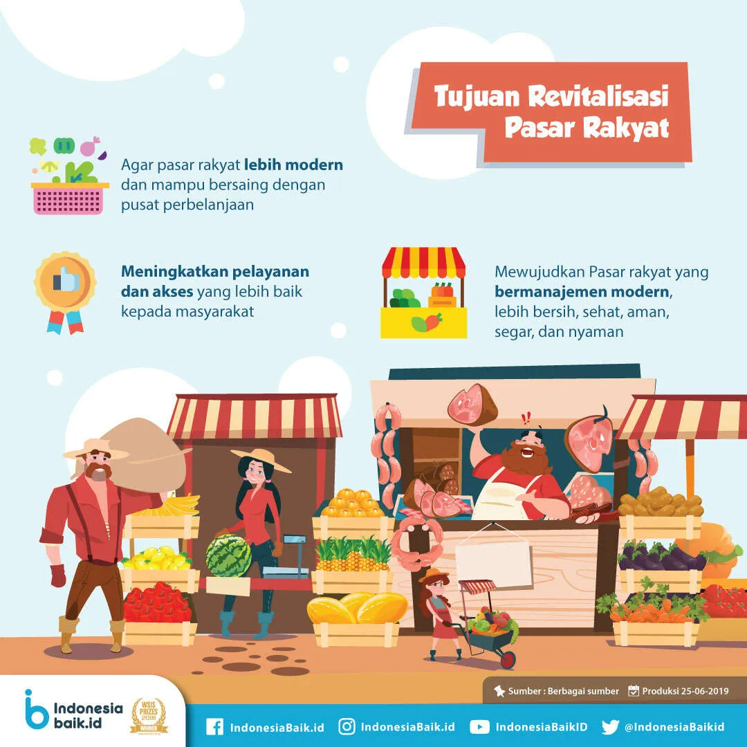 - Mewujudkan Pasar rakyat yang bermanajemen modern, lebih bersih, sehat, aman, segar, dan nyaman, sehingga dapat menjadi tujuan tetap belanja konsumen serta referensi dalam pembangunan pasar-pasar lainnya. Konsep dan Prinsip Revitalisasi Pasar Rakyat Program revitalisasi pasar rakyat Kemendag RI bukan hanya menyentuh perbaikan dari sisi perbaikan fisik saja, melainkan juga dari sisi ekonomi, sosial budaya dan manajemen.