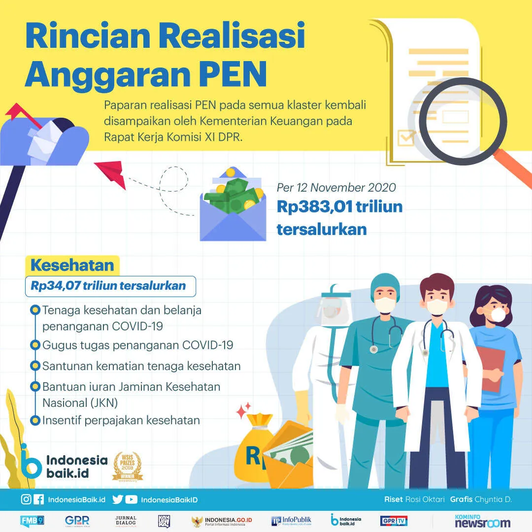 Indonesiabaik.id - Perkembangan realisasi PEN memang perlu diawasi oleh seluruh pihak agar terlaksana dengan baik dan tepat sasaran. Hingga 12 November 2020, telah terealisasi Rp383,01 triliun atau 55,1 persen dari anggaran PEN sebesar Rp695,2 triliun. Realisasi ini menunjukkan adanya akselerasi. Paparan pelaksanaan program Pemulihan Ekonomi Nasional (PEN) di semua kluster kembali disampaikan Menteri Keuangan Sri Mulyani pada Rapat Kerja Komisi XI DPR Kamis (12/11).