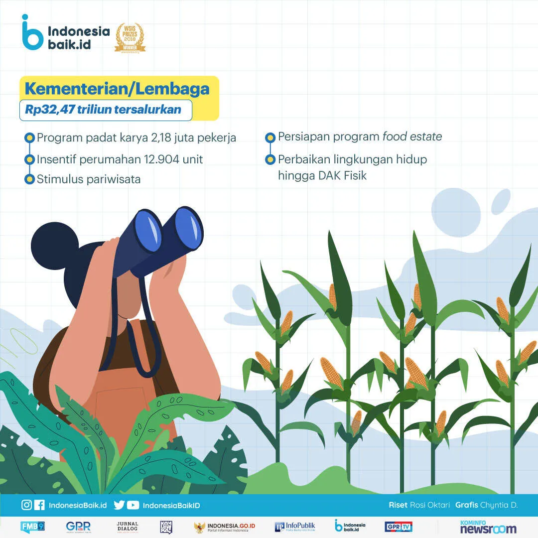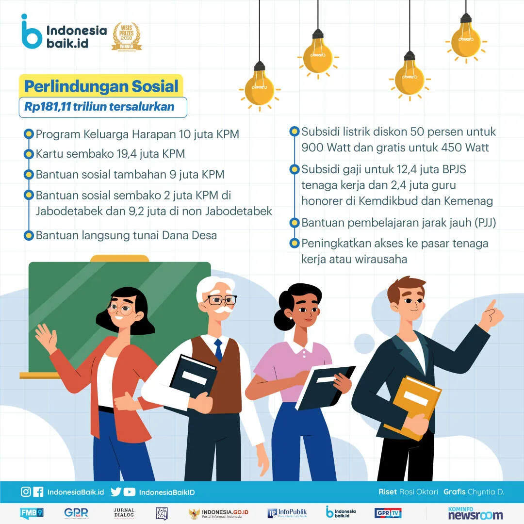 Telah mencapai 77,3 persen atau Rp181,11 triliun dari pagu penyesuaian Rp234,33 triliun. Adapun rinciannya terdiri penerima Program Keluarga Harapan sebanyak 10 juta Keluarga Penerima Manfaat (KPM), kartu sembako 19,4 juta KPM, bantuan sosial tambahan ada 9 juta KPM, bantuan sosial sembako hampir 2 juta KPM di Jabodetabek dan 9,2 juta di non Jabodetabek, plus bantuan langsung tunai Dana Desa.