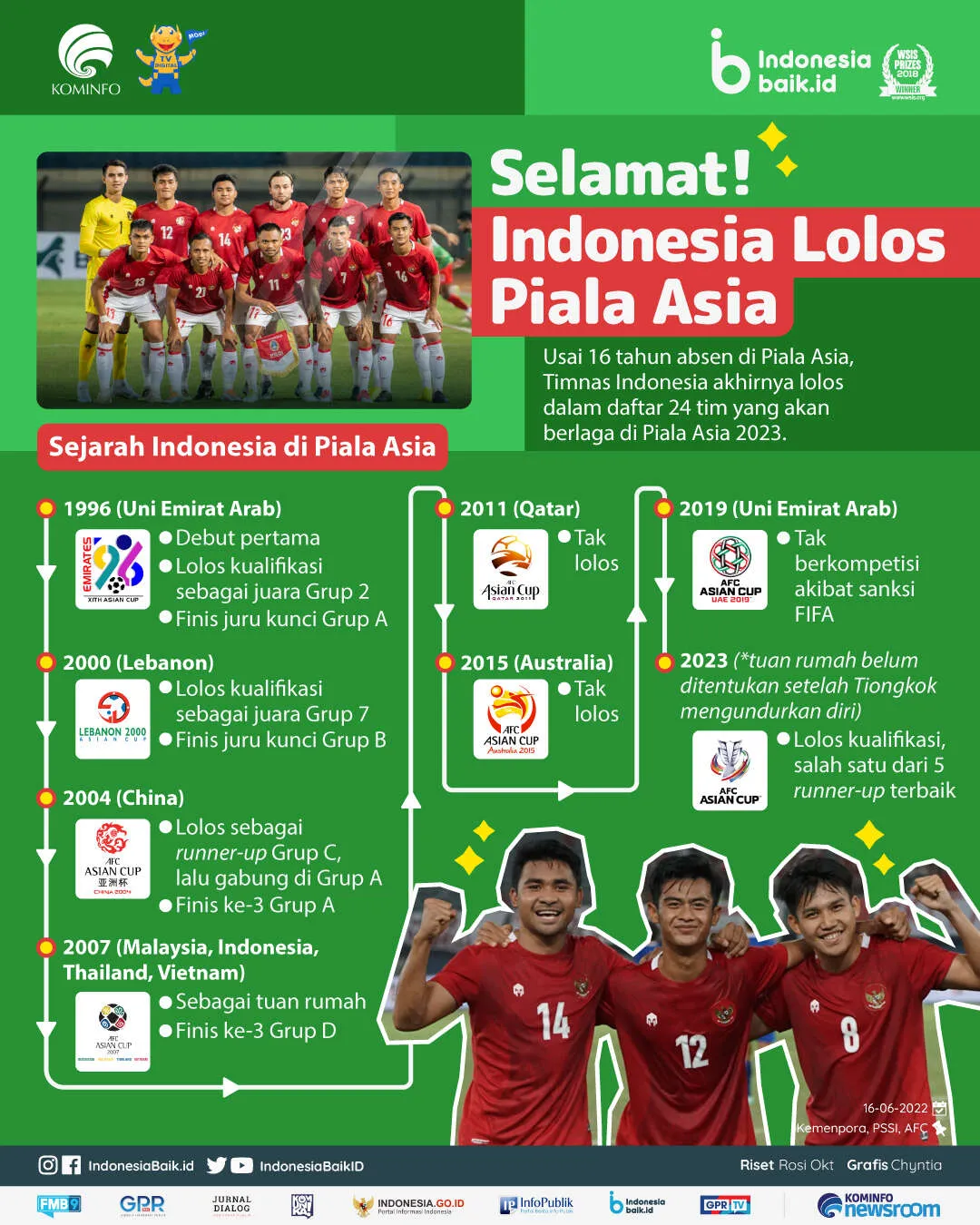 indonesiabaik.id — Usai 16 tahun absen di Piala Asia, Tim Nasional Indonesia (Timnas Indonesia) akhirnya lolos dalam daftar 24 tim yang akan berlaga di Piala Asia 2023.