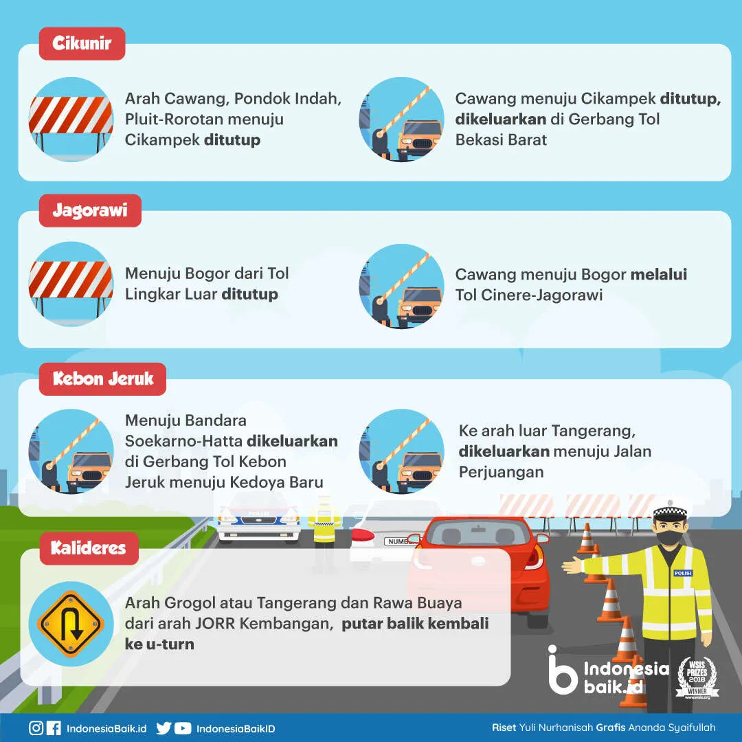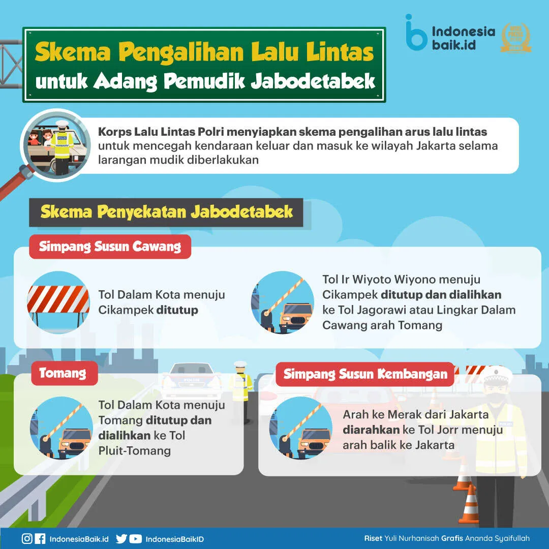 Skema ini akan diterapkan dengan ketat untuk seluruh kendaraan pribadi. Jika nantinya masih ditemui ada pemudik yang nekat pulang kampung maka tidak dibolehkan melanjutkan perjalanan. Dari data Korps Lalu Lintas Polri, berikut beberapa penyekatan yang dilakukan aparat di sekitar Jabodetabek: