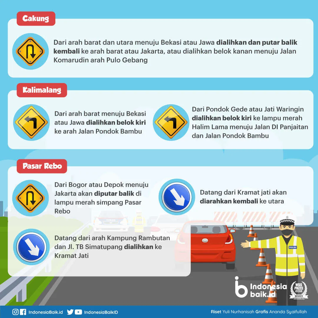 Arus kendaraan dari arah barat dan utara menuju Bekasi atau Jawa mulai dari Coca Cola-Jalan Perintis Kemerdekaan-Kelapa Gading-Warung Jengkol (Terminal Bus Pulo Gadung)- Jalan Sultan Hamengku Buwono-Pupar-Jalan Raya Bekasi-Pasar Cakung-Pos Pam Penyekatan Cacing (bawah jalan tol) dialihkan dan putar balik di U-Turn, lalu kembali ke arah barat atau Jakarta, atau dialihkan belok kanan menuju Jalan Komarudin arah Pulo Gebang.