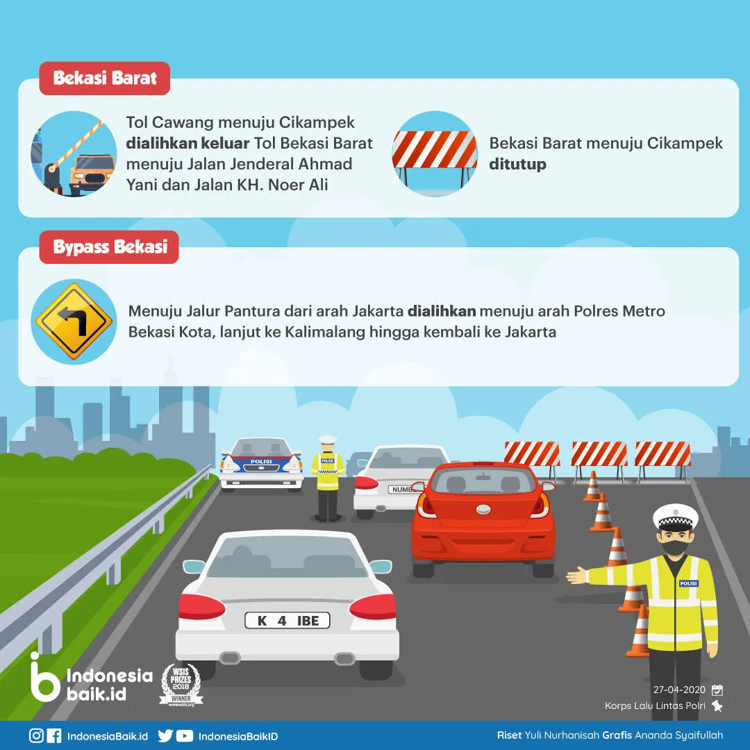 Arus lalu lintas dari arah Tol Cawang menuju Cikampek dialihkan keluar Tol Bekasi Barat menuju Jalan Jenderal Ahmad Yani dan Jalan KH. Noer Ali.