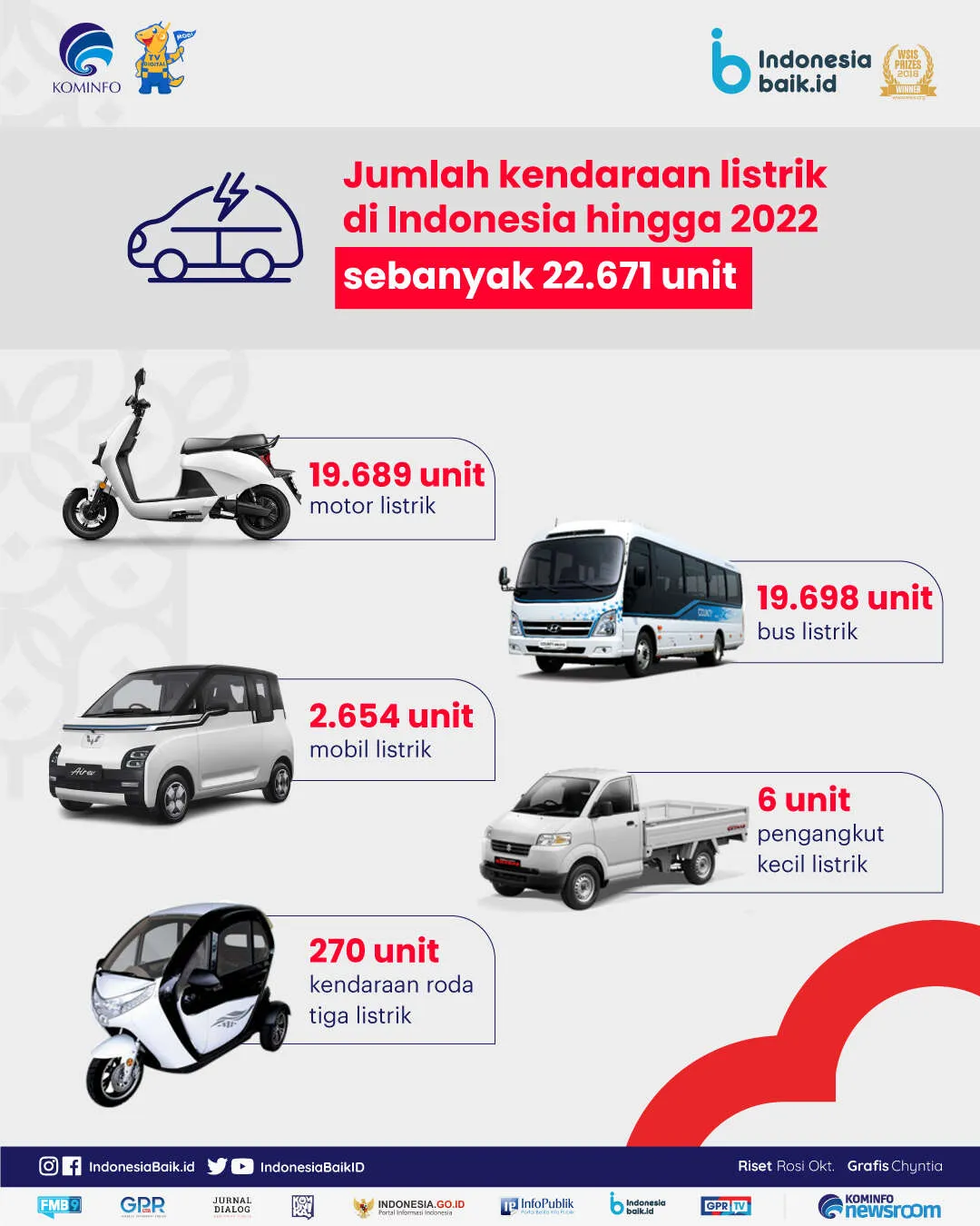 Jumlah kendaraan listrik di Indonesia hingga 2022 yaitu sebanyak 22.671 unit, terdiri dari 19.689 unit motor listrik, 2.654 unit mobil listrik, 270 unit kendaraan roda tiga listrik, 19.698 unit bus listrik dan 6 unit pengangkut kecil listrik.