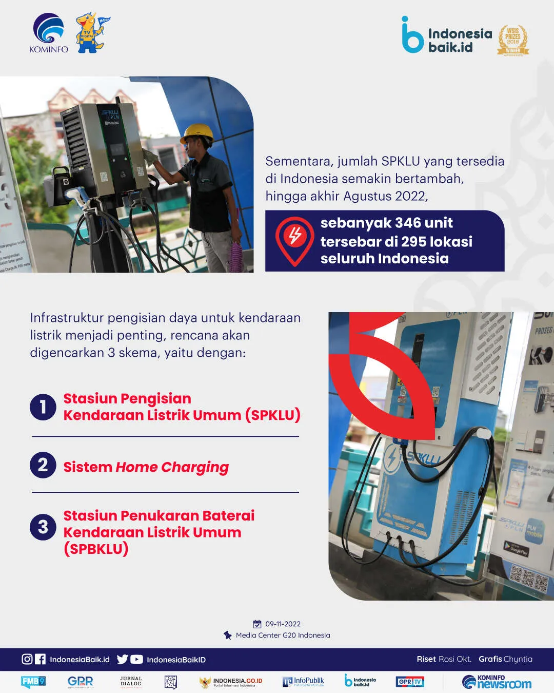 Sementara itu, jumlah SPKLU yang tersedia di Indonesia semakin bertambah hingga akhir Agustus 2022.yaitu sebanyak 346 unit yang tersebar di 295 lokasi seluruh Indonesia.