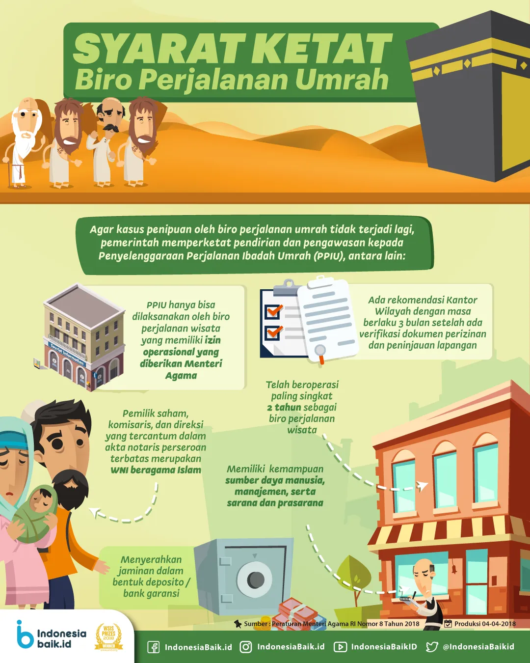 Indonesiabaik.id - Saat ini sedang marak kasus penipuan biro perjalanan umrah. Agar kasus penipuan oleh biro perjalanan umrah tidak terjadi lagi, pemerintah memperketat pendirian dan pengawasan kepada Penyelenggara Perjalanan Ibadah Umrah (PPIU).