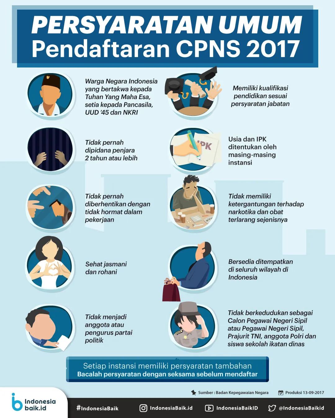 Untuk mencalonkan CPNS, syara utama adalah seorang WNI, Tidak pernah dipidana 2 tahun atau lebih, tidak pernah diberhentikan dengan tidak hormat, sehat jasmani dan rohani, tidak menjadi anggota atau pengurus partai politik, memiliki kualifikasi pendidikan sesuai persyaratan jabatan, sehat jasmani dan rohani, tidak memiliki ketergantungan terhadap narkotika dan obat terlarang sejenisnya, bersedia ditempatkan di seluruh wilayah di Indonesia, usia dan IPK ditentu oleh masing-masing instansi.