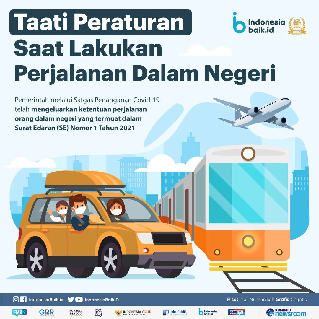 Indonesiabaik.id - Pemerintah melalui Satuan Tugas (Satgas) Penanganan Covid-19 telah mengeluarkan ketentuan perjalanan orang dalam negeri pada masa pandemi, yang berlaku pada 9-25 Januari 2021 yang termuat dalam Surat Edaran (SE) Nomor 1 Tahun 2021.
