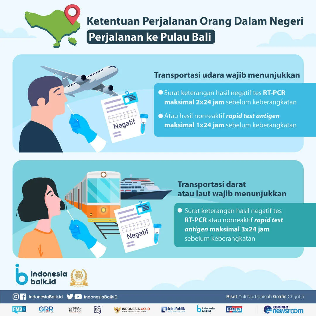 - Pelaku perjalanan udara wajib menunjukkan surat keterangan hasil negatif tes RT-PCR yang sampelnya diambil maksimal 3x24 jam, atau hasil nonreaktif rapid test antigen yang sampelnya diambil maksimal 2x24 jam sebelum keberangkatan sebagai persyaratan perjalanan