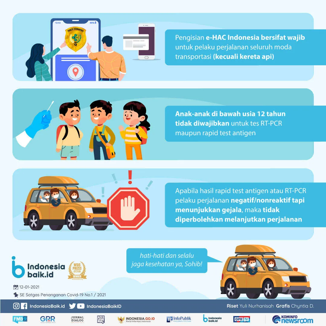 Anak-anak di bawah usia 12 tahun tidak diwajibkan untuk tes RT-PCR maupun rapid test antigen sebagai syarat perjalanan. Pengisian e-HAC Indonesia bersifat wajib bagi pelaku perjalanan dengan seluruh moda transportasi umum maupun pribadi.