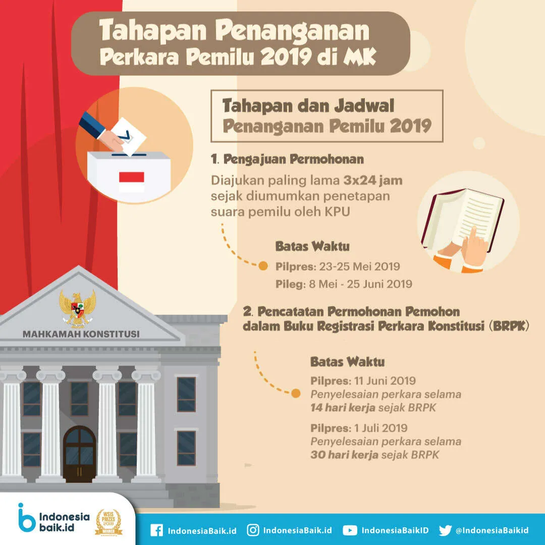 Indonesiabaik.id - Komisi Pemilihan Umum (KPU) telah melakukan rekapitulasi suara Pemilu 2019 di tingkat nasional. Rekapitulasi suara tingkat nasional ini dilaksanakan sejak 25 April sampai 22 Mei 2019. Setelah rekapitulasi tingkat nasional dan penetapan hasil penghitungan suara Pileg dan Pilpres tingkat nasional selesai, tahapan selanjutnya yakni jika ada pihak yang tidak terima hasil dari rekapitulasi tersebut bisa melaporkan sengketa ke Mahkamah Konstitusi (MK).