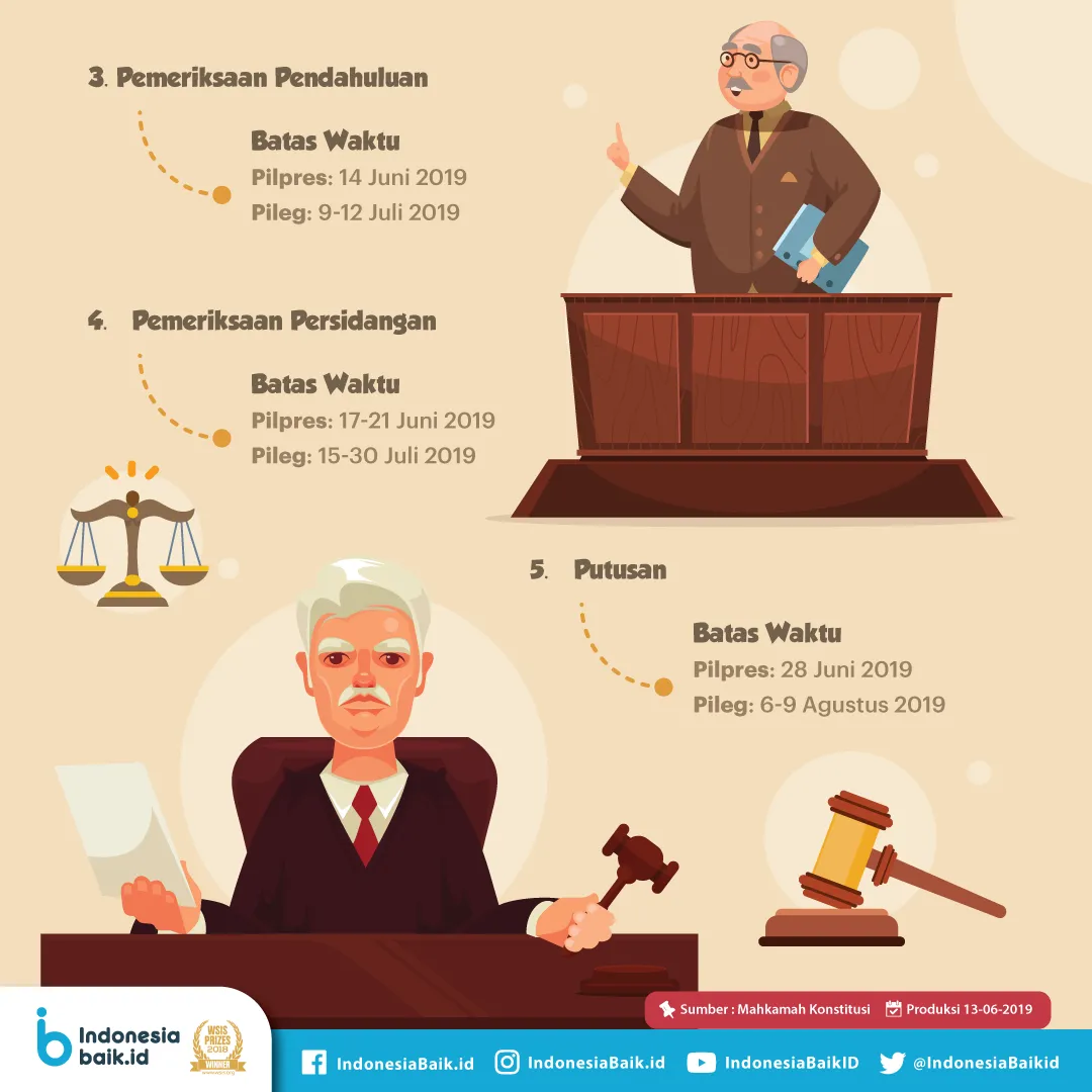 Tahap selanjutnya adalah sidang pendahuluan untuk Pemilu Presiden diagendakan digelar pada 14 Juni, sementara Pemilu Legislatif pada 9 Juli hingga 12 Juli 2019. Selanjutnya, pada tanggal 17 Juni sampai 21 Juni 2019 dijadwalkan pemeriksaan saksi dan alat bukti untuk Pemilu Presiden. Sedangkan, untuk Pileg diagendakan pada 13 Juni-30 Juni 2019. Kemudian, hakim konstitusi akan menggelar rapat permusyawaratan hakim pada 24-27 Juni 2019.
