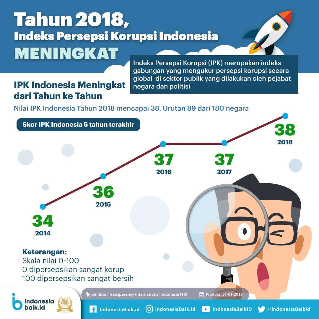 Indonesiabaik.id - Corruption Perception Index (CPI) alias Indeks Persepsi Korupsi (IPK) Indonesia 2018 yang dirilis Transparency International Indonesia (TII) menunjukkan kenaikan yaitu naik 1 poin dari 37 pada 2017 menjadi 38 pada 2018. Indeks Persepsi Korupsi (IPK) sendiri merupakan indeks gabungan yang mengukur persepsi korupsi secara global di sektor publik yang dilakukan oleh pejabat negara dan politisi