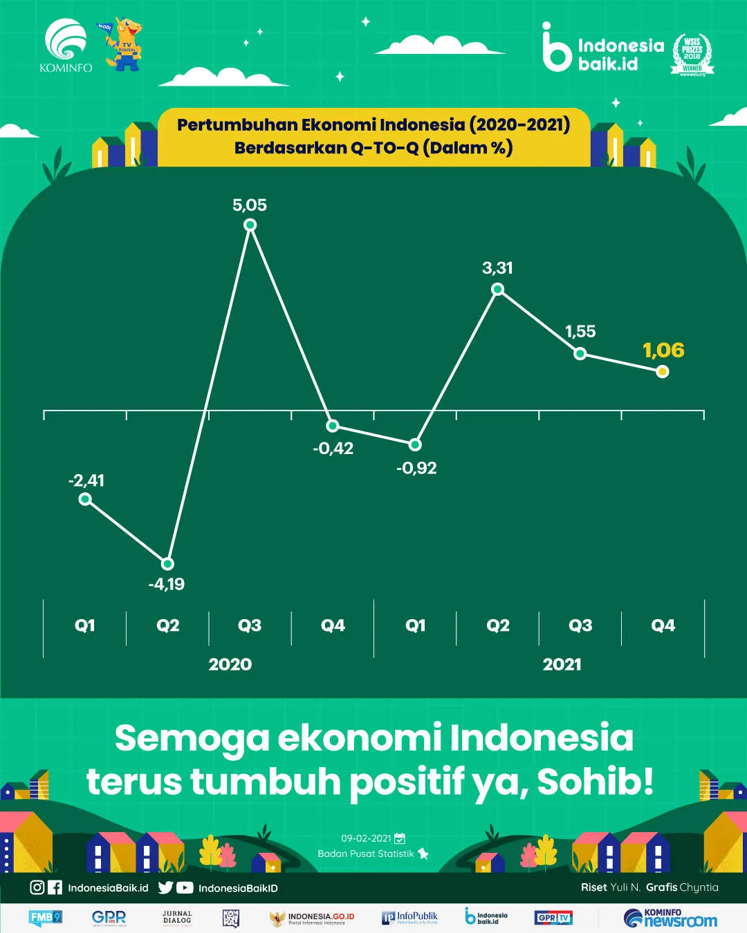 Ekonomi Indonesia pada triwulan IV-2021 tumbuh sebesar 1,06 persen (q-to-q) dan bila dibandingkan dengan triwulan IV-2020 ekonomi Indonesia tumbuh 5,02 persen (y-on-y), dan secara kumulatif artinya selama tahun 2021 ekonomi Indonesia tumbuh sebesar 3,69 persen (c-to-c).